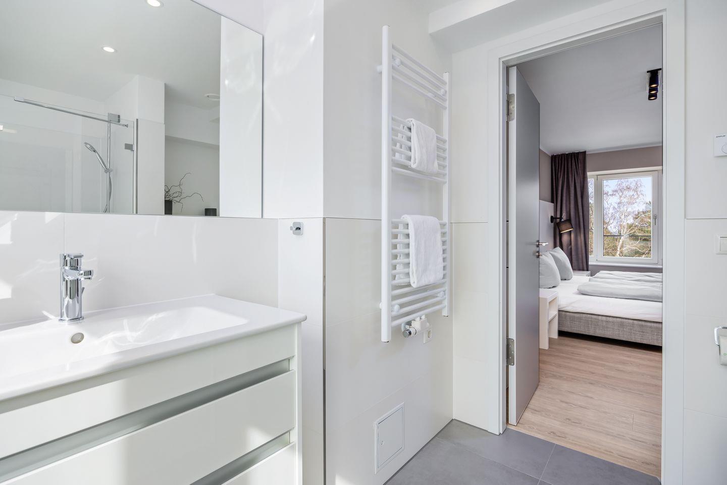 In diesem Apartment ist ein hohes Maß an Privatsphäre gewährleistet; es stehen euch drei separate Schlafzimmer zur Verfügung. Das größte der drei Schlafzimmer bietet dabei einen besonders hohen Komfort durch ein eigenes Badezimmer, ein modernes Boxspring-Doppelbett (1,80 x 2,00 m), Kleiderschrank und einen eigenen SMART-TV (43 Zoll). In den weiteren Schlafzimmern befinden sich ein komfortables Boxspring-Doppelbett (1,80 x 2,00 m) und ein Kleiderschrank bzw. ein Boxspring-Einzelbett (0,90 x 2,00 m) und ein kleiner Schreibtisch sowie ebenfalls ein Kleiderschrank.