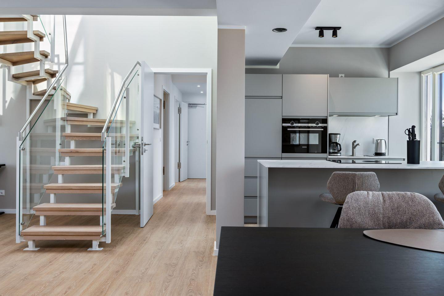 Das geschmackvoll eingerichtete Nichtraucher-Apartment verfügt über Fußbodenheizung, z.T. bodentiefe Fenster, kostenfreies WLAN und eine voll ausgestattete offene Küche mit Geschirrspüler, Kühlschrank mit Gefrierfach, Filterkaffeemaschine, Mixer, Toaster, Wasserkocher, Mikrowelle mit Backofenfunktion und 4-Felder Induktionsherd von BORA sowie über einen behaglichen und großzügigen Wohn-Essbereich. Im Wohnbereich befindet sich ein großer SMART-TV (55 Zoll).