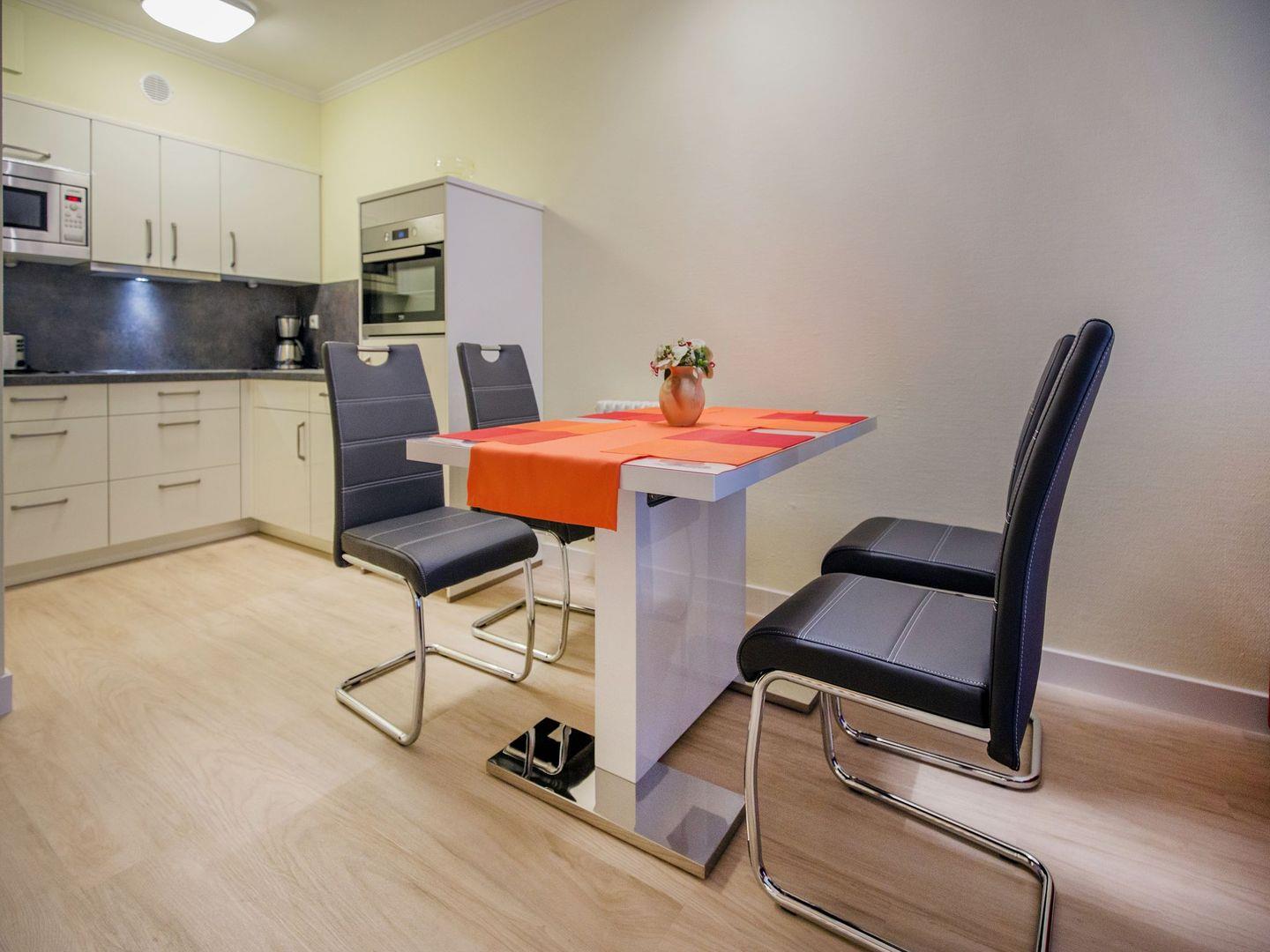 Diese komfortable Ferienwohnung bietet alles was das Herz begehrt und lädt Sie zu einem Frühstück auf Ihrer privaten Terrasse ein. Der Wohnraum verbindet ein gemütliches Wohnzimmer, inklusive eines ausziehbaren Schlafsofas, mit einem Essbereich und einer voll ausgestatteten Küche. Vorhanden sind ein Geschirrspüler, ein Backofen mit Kochfunktion, eine Mikrowelle sowie ein Wasserkocher, eine Kaffeemaschine und ein Toaster. Das Wohnzimmer überzeugt mit einem 55 Zoll LCD-Flachbildschirm, einer Stereo-Anlage und einem DVD-Player. Das Schlafzimmer ist mit einem Doppelbett ausgestattet und bietet genügend Verstaumöglichkeiten für Ihre Kleidung. Im Badezimmer erwarten Sie eine geräumige Dusche, ein Waschbecken, ein WC sowie ein großer Ganzkörperspiegel. Haustiere sind in dieser Wohnung herzlich willkommen.