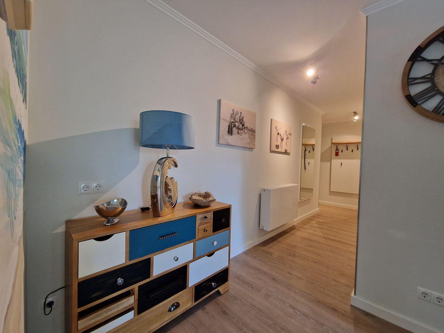 Diese komfortable Ferienwohnung bietet alles was das Herz begehrt und lädt Sie zu einem Frühstück auf Ihrer privaten Terrasse ein. Der Wohnraum verbindet ein gemütliches Wohnzimmer, inklusive eines ausziehbaren Schlafsofas, mit einem Essbereich und einer voll ausgestatteten Küche. Vorhanden sind ein Geschirrspüler, ein Backofen mit Induktionsfeld, eine Mikrowelle sowie ein Wasserkocher, eine Nespresso Kaffeemaschine und ein Toaster. Das Wohnzimmer überzeugt mit einem 55 Zoll LCD-Flachbildschirm, einem DVD-Spieler, einer Stereo-Anlage, einer Hifi Anlage sowie einer Teufel Musikstation. Das Schlafzimmer ist mit einem großen Doppelbett ausgestattet, verfügt über einen 43 Zoll Smart TV und bietet genügend Verstaumöglichkeiten für Ihre Kleidung im Schlafzimmer als auch in der angrenzenden Ankleide. Im Badezimmer erwarten Sie eine geräumige Dusche, ein Waschbecken, ein WC sowie ein großer Ganzkörperspiegel. In der Zeit von Mai bis September ist ein eigener Strandkorb am Strand inklusive