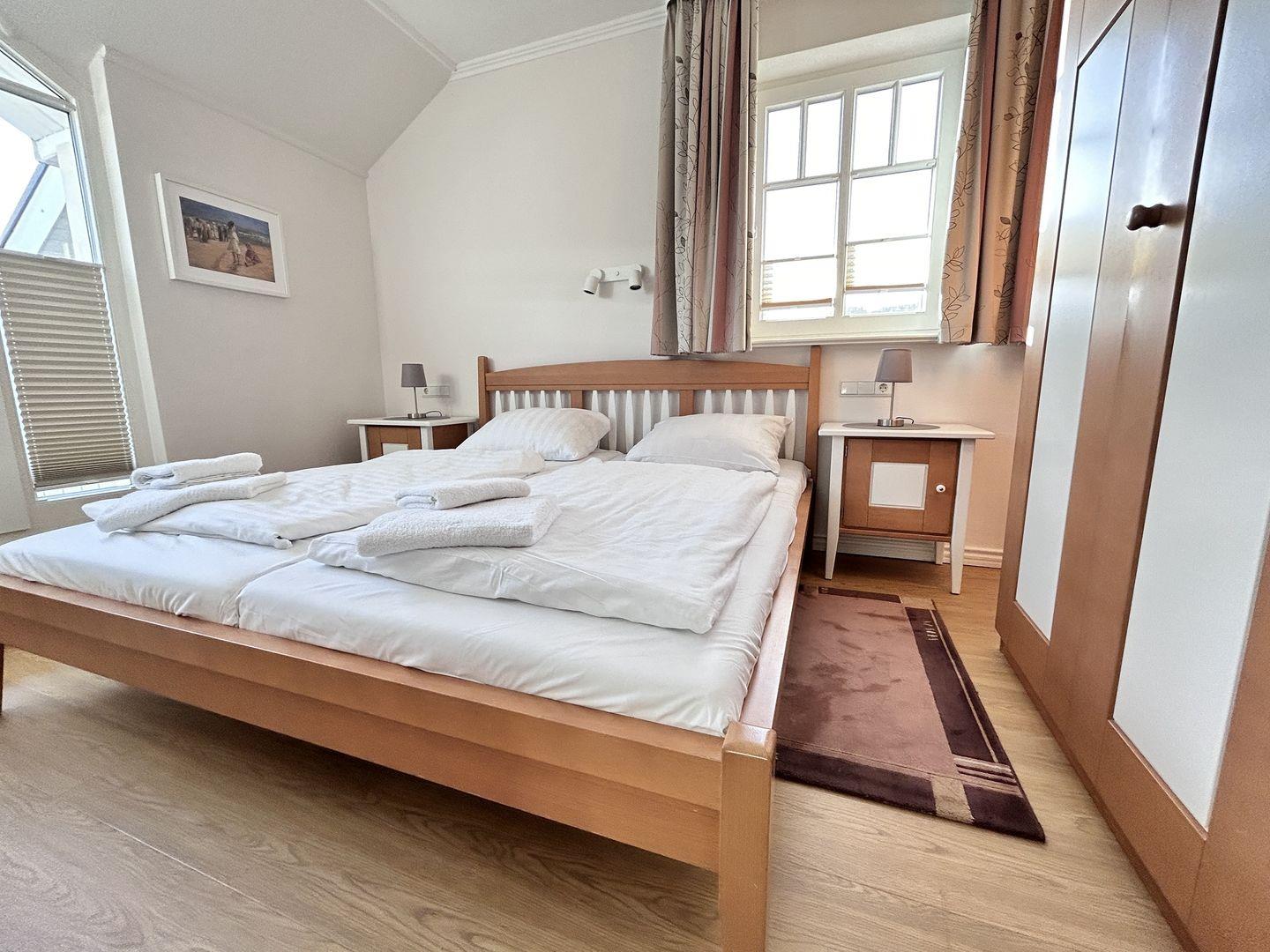 Diese komfortable Ferienwohnung bietet alles, was das Herz begehrt. Der Tag kann auf dem nach Südosten ausgerichteten Balkon in der Morgensonne beginnen. Der Wohnraum kombiniert den schönen Ess- und Wohnbereich mit der großzügig ausgestatteten Küchenzeile. Der Küchenbereich umfasst einen Herd mit Backofen und Cerankochfeld, einen Geschirrspüler, eine Mikrowelle, einen Kühlschrank mit Gefrierfach sowie diverse Elektrogeräte (z.B. Wasserkocher, Filterkaffeemaschine, Toaster, Mixer). Im einladenden Wohnzimmerbereich lässt es sich auf dem gemütlichen Sofa mit Recamiere sowie im bequemen Sessel entspannen. Ein Fernseher mit einem LCD-Flachbildschirm, ein HDMI-Anschluss für eine Play-Station, ein Blu-Ray- / DVD-Player, DAB-Radio mit CD-Player, diverse Brett- und Kartenspiele für Jung und Alt sowie eine Auswahl an Literatur sorgen für abwechslungsreiche Unterhaltung. Beide Schlafzimmer liegen separat und verfügen jeweils über ein Doppelbett und ausreichend Stauraum in den Kleiderschränken. Einer der Schränke ist mit einem Tresor ausgestattet. Das Badezimmer mit Fenster bietet eine geräumige Dusche, ein Waschbecken, ein WC und einen großen Spiegel. Zwei komfortable Strandstühle (klappbar / Liegeposition verstellbar) sowie diverses Strandspielzeug stehen den Gästen ebenfalls kostenlos zur Verfügung.