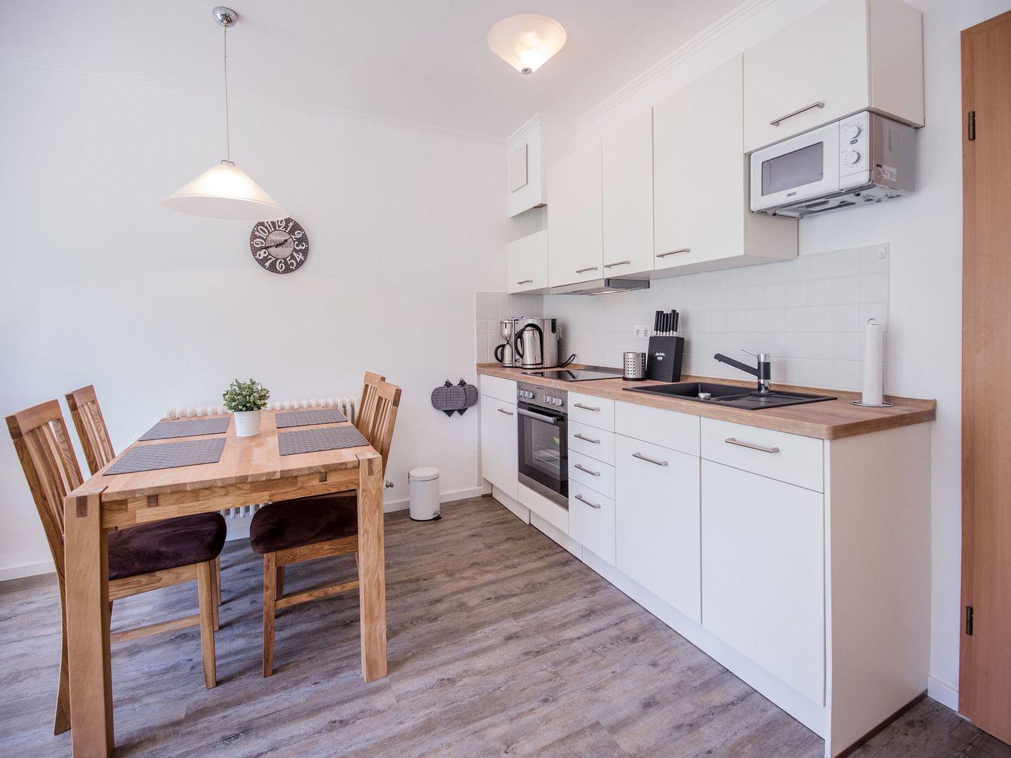 Diese gemütliche Ferienwohnung mit privatem Balkon besteht aus einem großen Wohnraum und einem separaten Schlafzimmer mit Doppelbett. Die Wohnküche mit Essbereich ist vollständig eingerichtet und überzeugt mit einem Geschirrspüler, einer Koch-und Backmöglichkeit, einer Mikrowelle, einem Wasserkocher, einer Kaffeemaschine und einem Toaster. Das Wohnzimmer punktet neben einer Schlafcouch auch mit einem LCD-Flachbildschirm, einem DVD-Player und einer Stereo-Anlage. Das Badezimmer verfügt über eine geräumige Dusche, ein Waschbecken, ein WC und einen großen Spiegel. In der Zeit von Mai bis September ist ein eigener Strandkorb am Strand kostenfrei nutzbar.