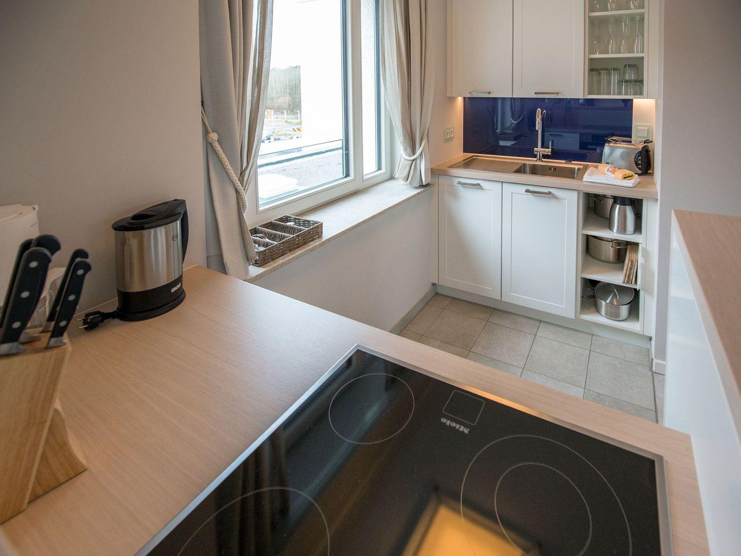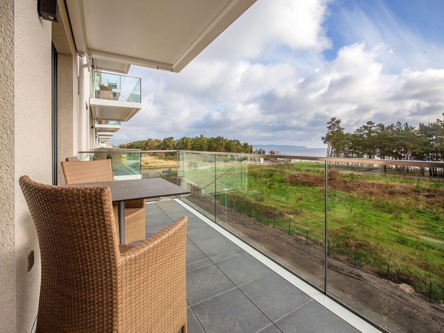 Dünenresidenz Neues Prora, Wohnzimmer mit LCD-TV, Balkon mit Meerblick, eingerichtete Küchenzeile mit Geschirrspüler und Backofen, 2 Schlafzimmer mit Doppelbett und davon eines mit Fernseher, separates Ankleidezimmer, ein Bad mit Dusche, eigene Sauna, ein Bad mit Badewanne, kostenfreier WLAN-Anschluss, Haustiere erlaubt, Nichtraucher