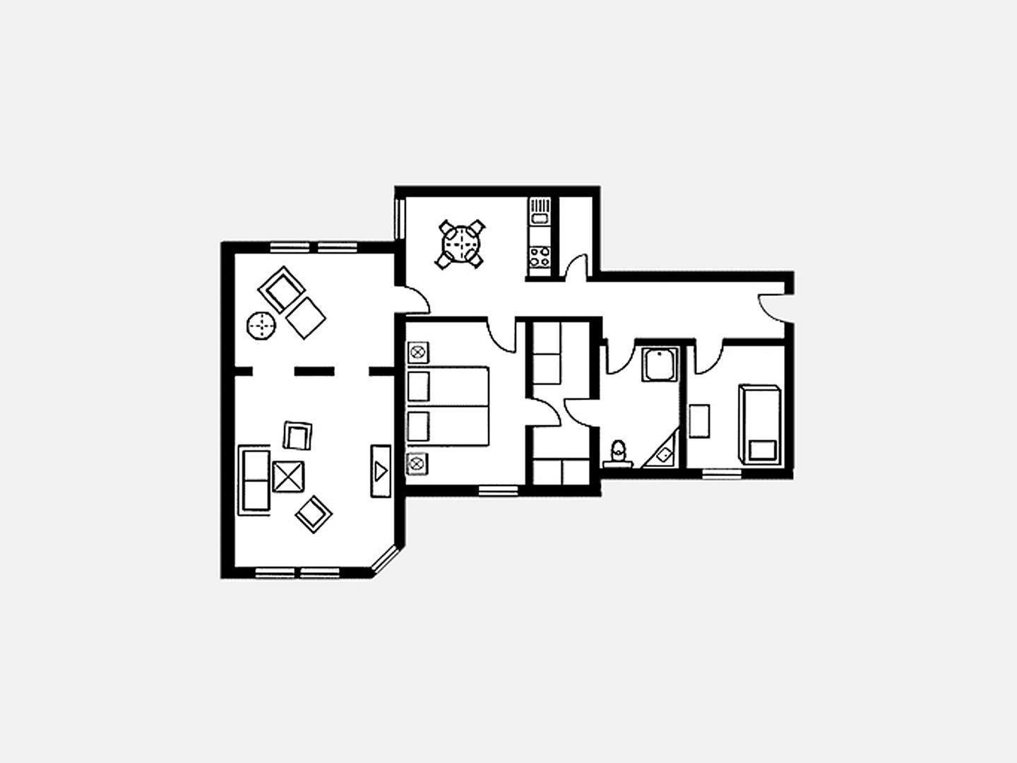 Der Wohnraum dieser geräumigen Ferienwohnung verbindet das Wohnzimmer mit seeseitiger Fensterfront mit einem Essbereich und einer gut ausgestatteten Küche. Vorhanden sind hier ein 4-Platten-Ceranherd, ein Geschirrspüler, eine Mikrowelle mit Grillfunktion, ein Wasserkocher und ein Toaster. Im Wohnzimmer finden sich der Flachbildfernseher, die Stereo-Anlage und der DVD-Player. Beide Schlafzimmer liegen separat und verfügen einmal über ein Doppelbett und einmal über ein Doppelstockbett. Das Badezimmer überzeugt mit einer geräumigen Dusche, einem Waschbecken, einem WC und einem großen Spiegel.