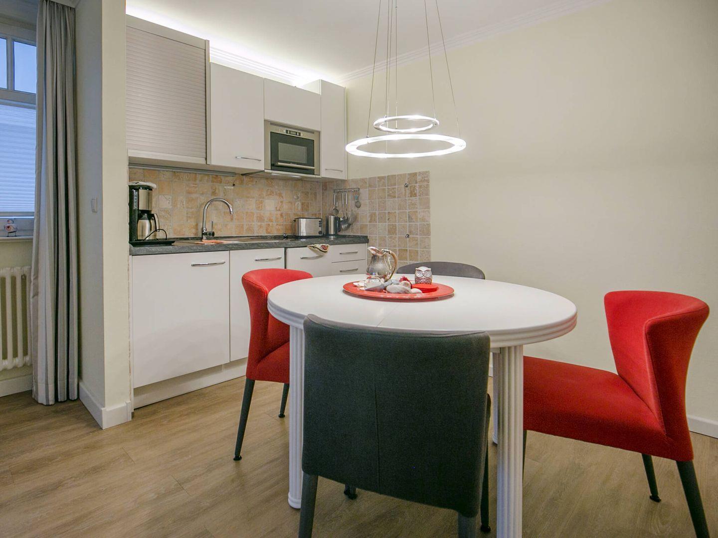 Villa Seestern; Wohnzimmer mit seeseitigem Balkon, Schlafzimmer mit LCD-HD Smart TV, eingerichtete Küchenzeile mit Geschirrspüler und Mikrowelle, Cerankochfeld mit zwei Kochfeldern, Dusche/ WC, LCD – Smart TV, Stereo-Anlage, Telefon, Nichtraucher, Haustiere nicht erlaubt, kostenfreier WLAN-Anschluss, eigene 100MB/s, max. Belegung 2 Erwachsene und 1 Kind, eigener Strandkorb (Mai - September) kostenfrei nutzbar