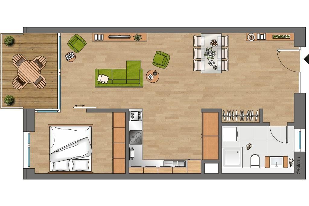 Das allergikerfreundliche Apartment mit 2 Zimmern, 68 qm, Balkon, Fußbodenheizung und Kaminofen ist ideal für 3 Personen und versprüht durch lichtdurchflutete Räume angenehme Leichtigkeit und Wohlfühlatmosphäre.