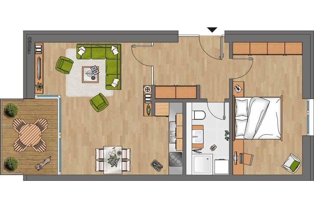 Zum Nichtraucher-Apartment der gehobenen Ausstattung gehören kostenfreies WLAN, ein Schlafzimmer mit Doppelbett, ein Wohnbereich mit Doppelschlafcouch (1,40 x 1,90 m) und angrenzendem Südwestbalkon und Bad mit Dusche.
