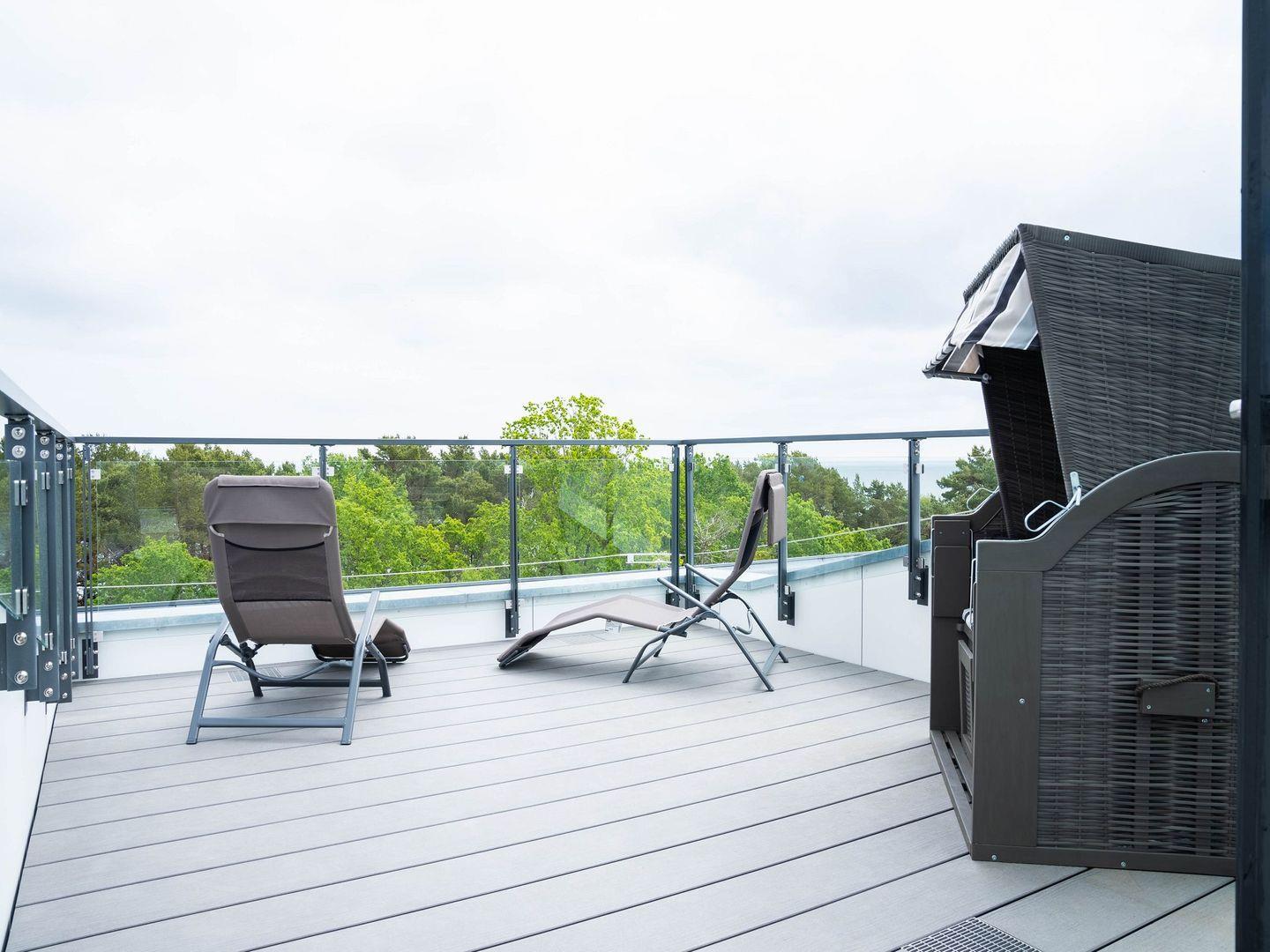 Diese hochwertig eingerichtete Maisonette Ferienwohnung mit zwei privaten Balkonen mit Meerblick besteht aus einem großen Wohnraum mit Küche, Esszimmer und zwei separaten Schlafzimmern. Das Wohnzimmer verfügt über ein Schlafsofa (140er breit). Die Küchenzeile ist eingerichtet und überzeugt mit einem Kochfeld, einem Backofen, einem Geschirrspüler, einem Wasserkocher, einer Kaffeemaschine und einem Toaster. Beide Schlafzimmer liegen separat und sind jeweils mit einem King Size Boxspringbett ausgestattet. Eines der Schlafzimmer verfügt über ein Duschbad en Suite. Zudem verfügt die Wohnung über zwei weitere Badezimmer, hiervon eines mit Dusche und eines mit Badewanne, Waschbecken, WC und großen Spiegeln. Haustiere sind leider nicht gestattet. Highlight ist die große Dachterrasse mit Strandkorb.