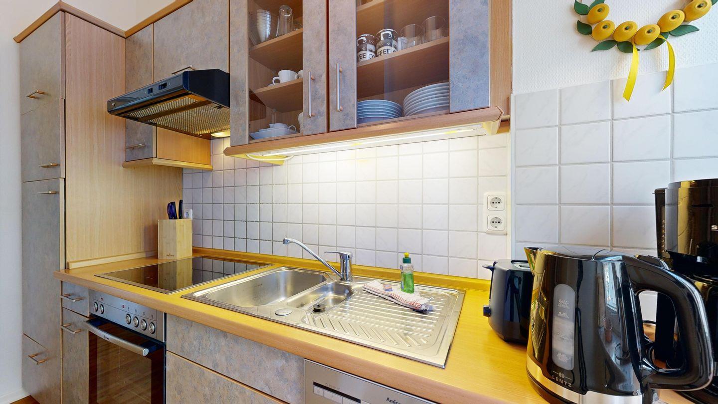 * Separate Küche: Moderne Küchenzeile, Ceran-Herd mit Backofen, Spülmaschine, Wasserkocher, Kaffeemaschine, Toaster