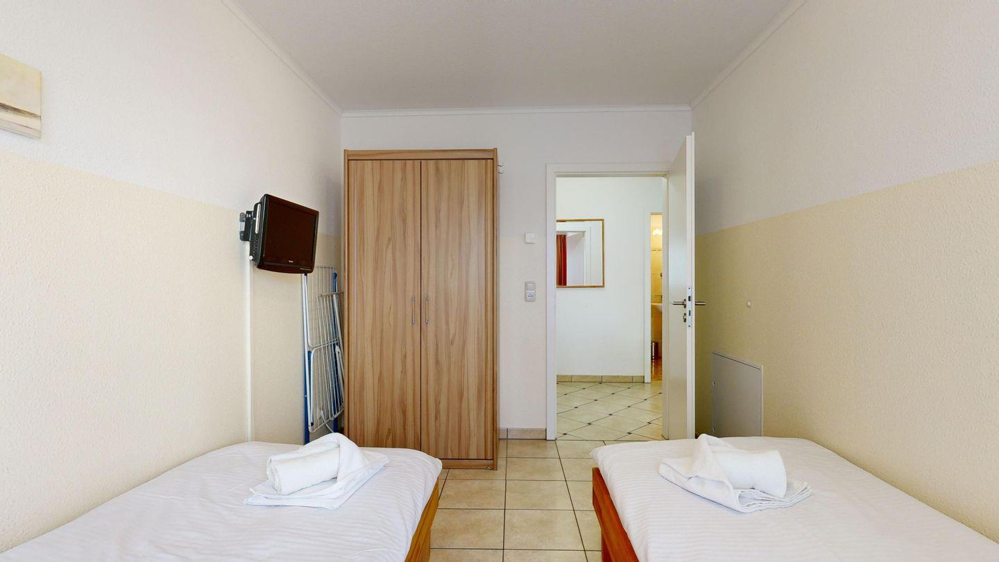 * 1 Schlafzimmer mit zwei Einzelbetten (90 x 200 cm), Schrank und TV