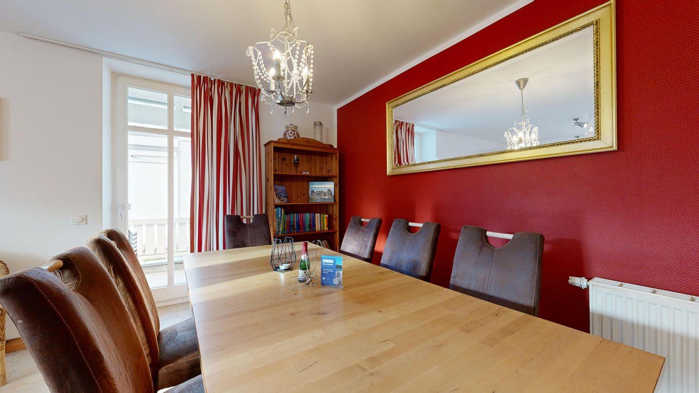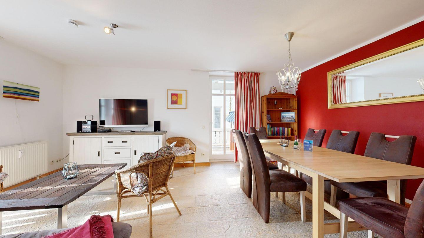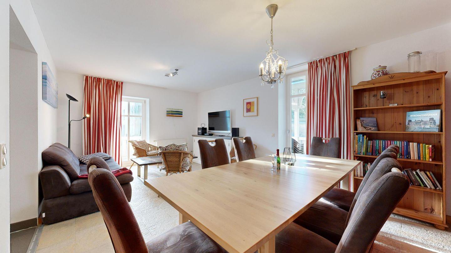 * Wohnzimmer: Couchgarnitur, Smart-TV, großer Esstisch mit Stühlen, WLAN-Internetanschluss, diverse Gesellschaftsspiele, kleine Bibliothek