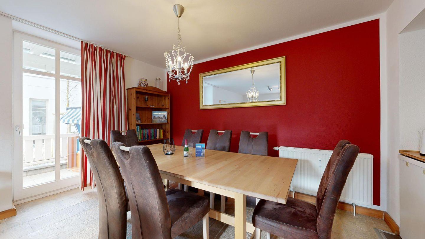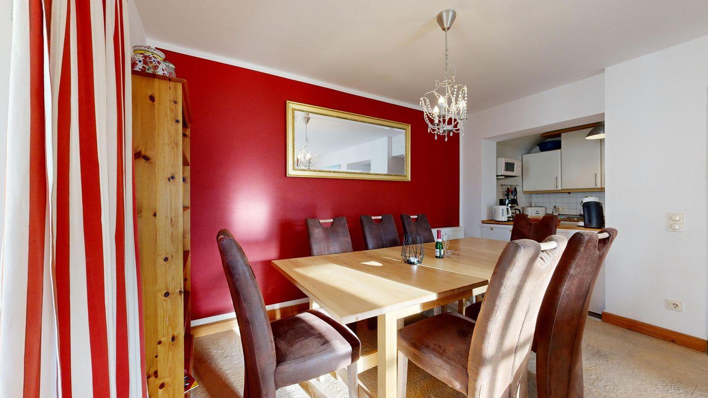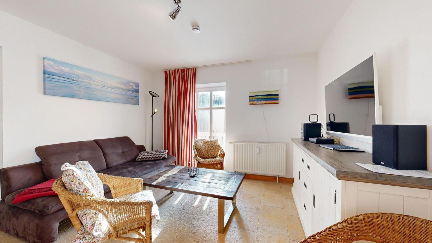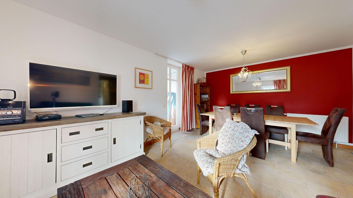 * Wohnzimmer: Couchgarnitur, Smart-TV, großer Esstisch mit Stühlen, WLAN-Internetanschluss, diverse Gesellschaftsspiele, kleine Bibliothek