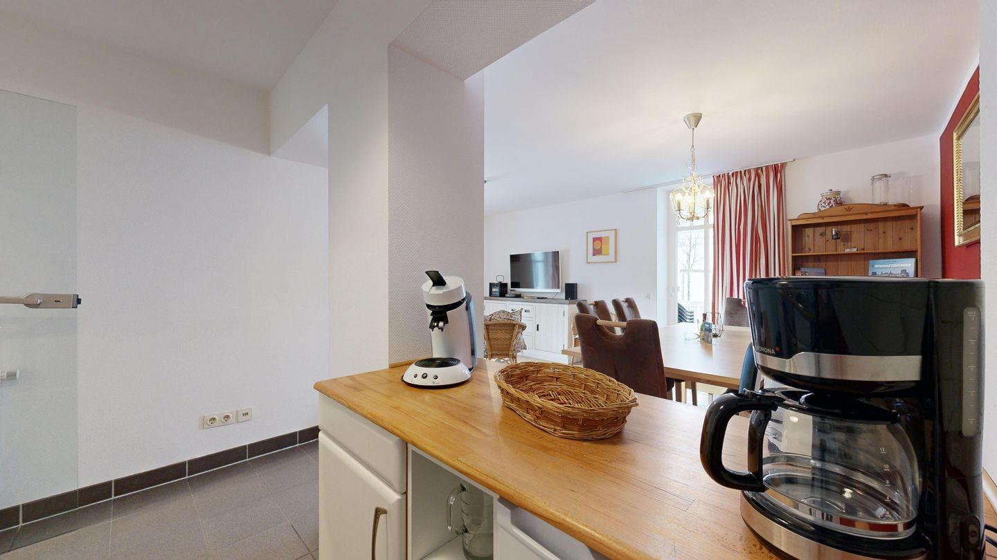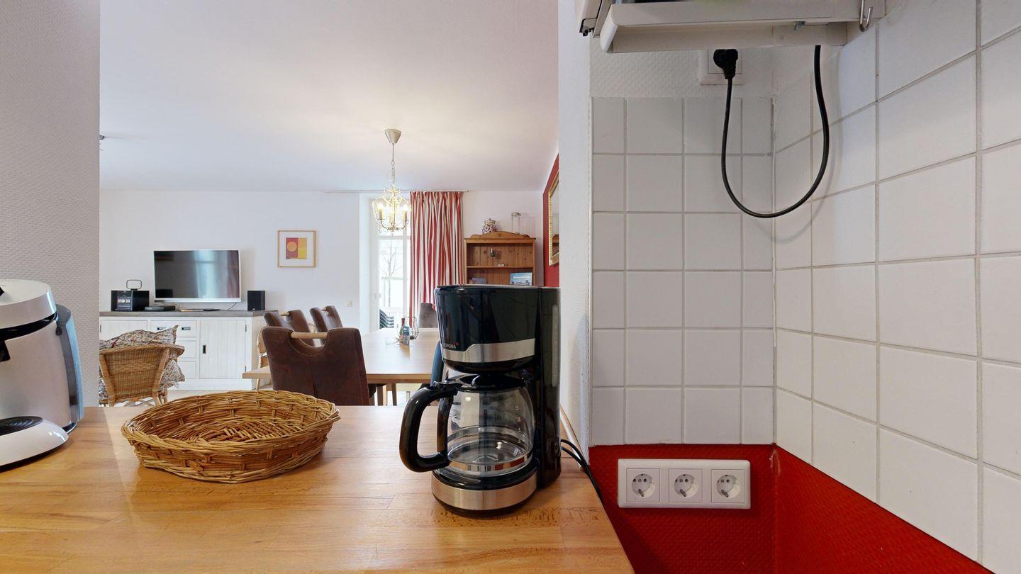 * Küchenzeile: E-Herd mit Backofen, Spülmaschine, Mikrowelle, Kühlschrank mit Gefrierfach, Wasserkocher, Kaffeemaschine und Toaster