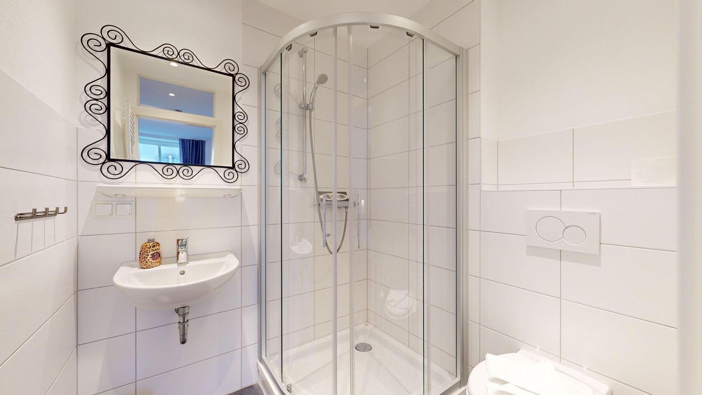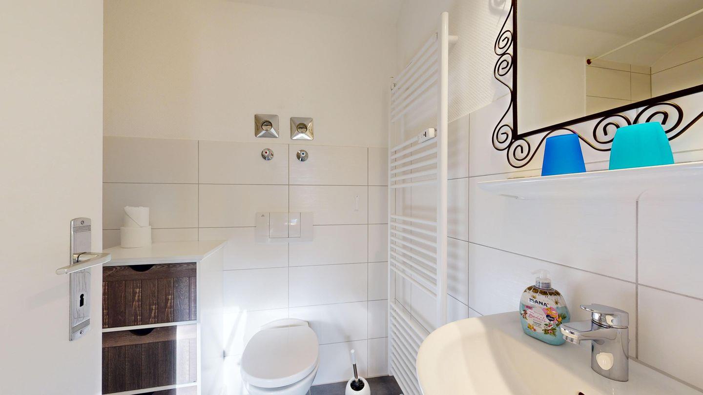 * 1 Badezimmer mit Waschbecken, Badewanne, WC und Föhn