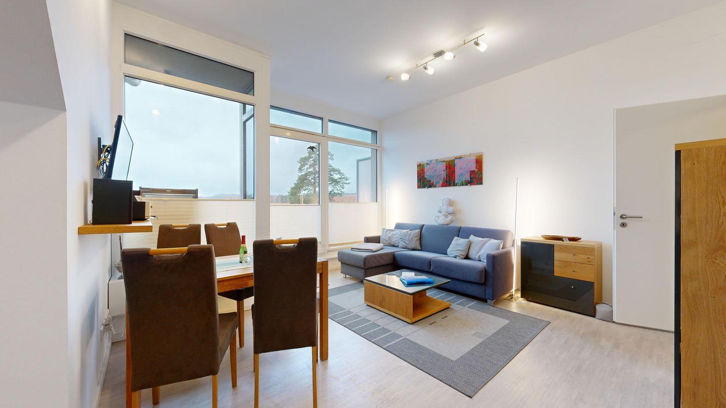 * Freundliches, helles Wohnzimmer mit Südwest-Balkon: Gemütliche Couchgarnitur, Smart-TV mit 55-Zoll-Bildschirm, Kabel-TV-Anschluss , Internetzugang (WLAN inkl.), Esstisch