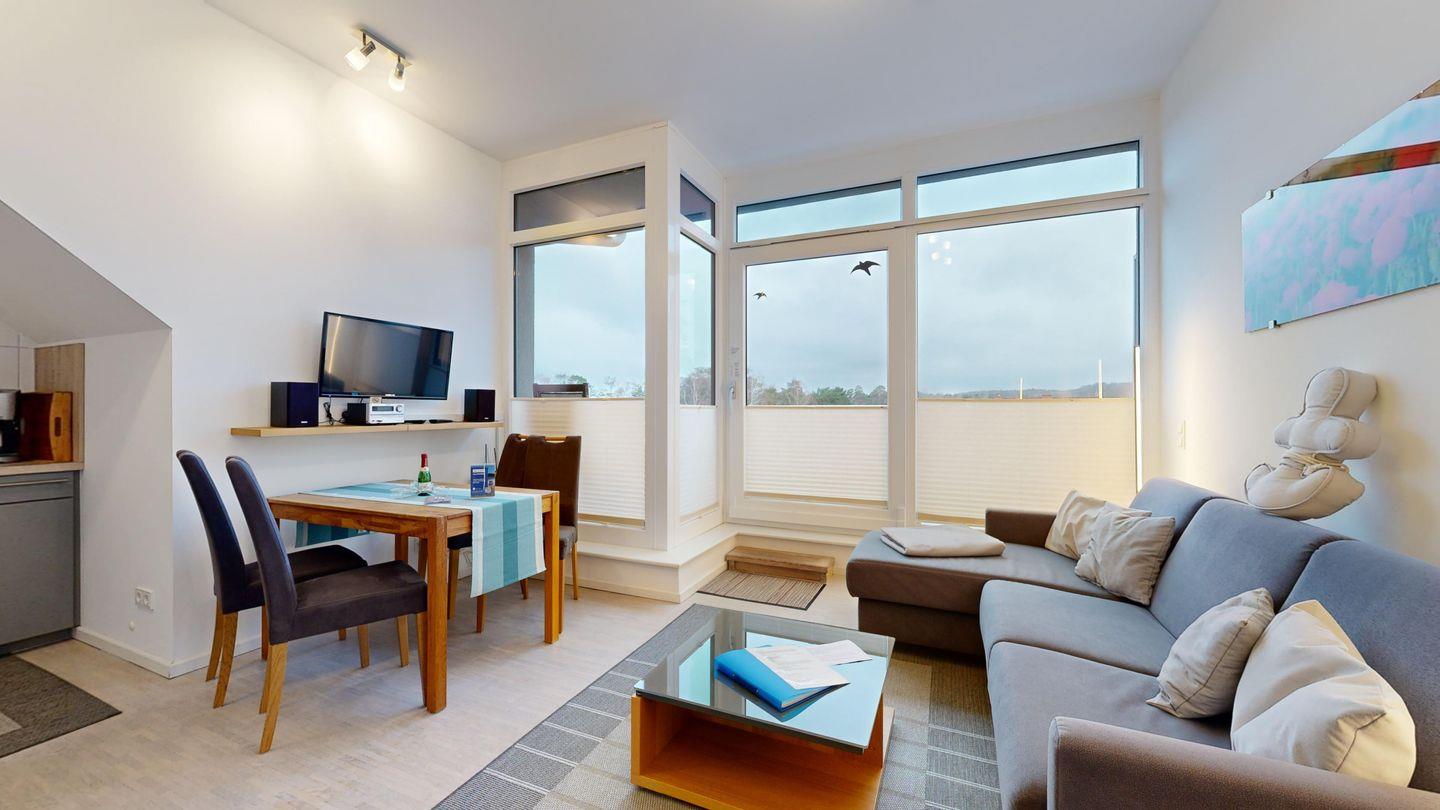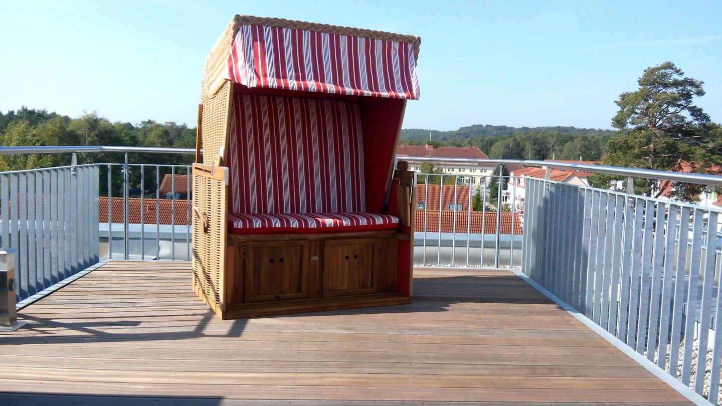 * Zusätzlich gibt es über eine Treppe eine Dachterrasse mit einem Strandkorb und einem fantastischen Rundumblick über ganz Binz. Bei der Dachterrasse weisen wir auf eine eingeschränkte Nutzungsmöglichkeit hin. Es ist der Lebensraum der Möwen, die hier zu Hause sind und sich durchaus bemerkbar machen.