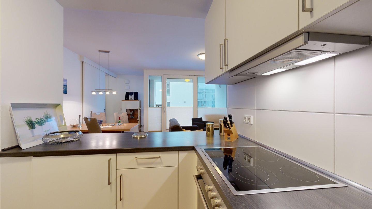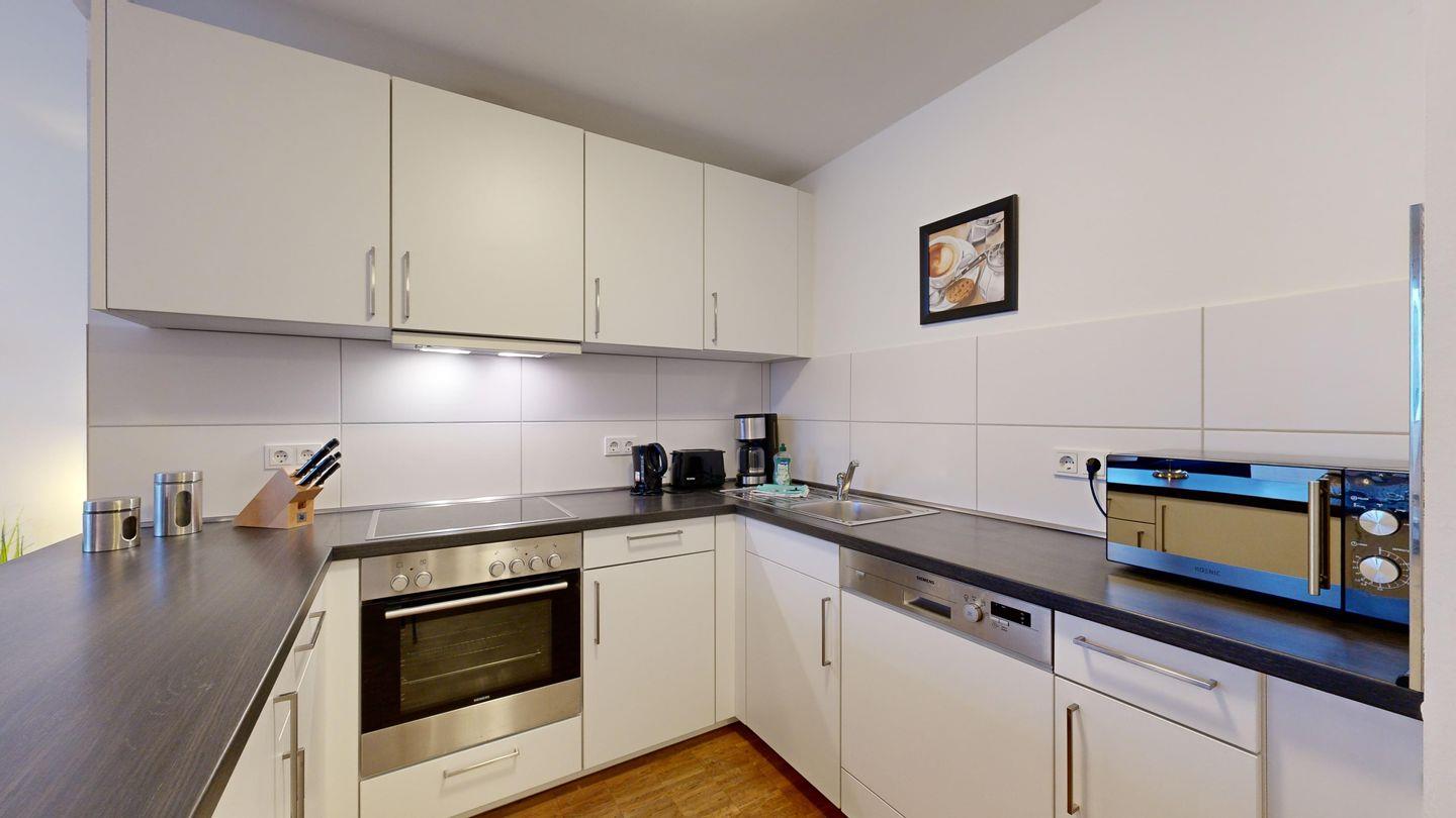 * Küche: Moderner, großer Küchenbereich mit Ceran-Herd, Backofen, Spülmaschine, Mikrowelle, Wasserkocher, Kaffeemaschine und Toaster