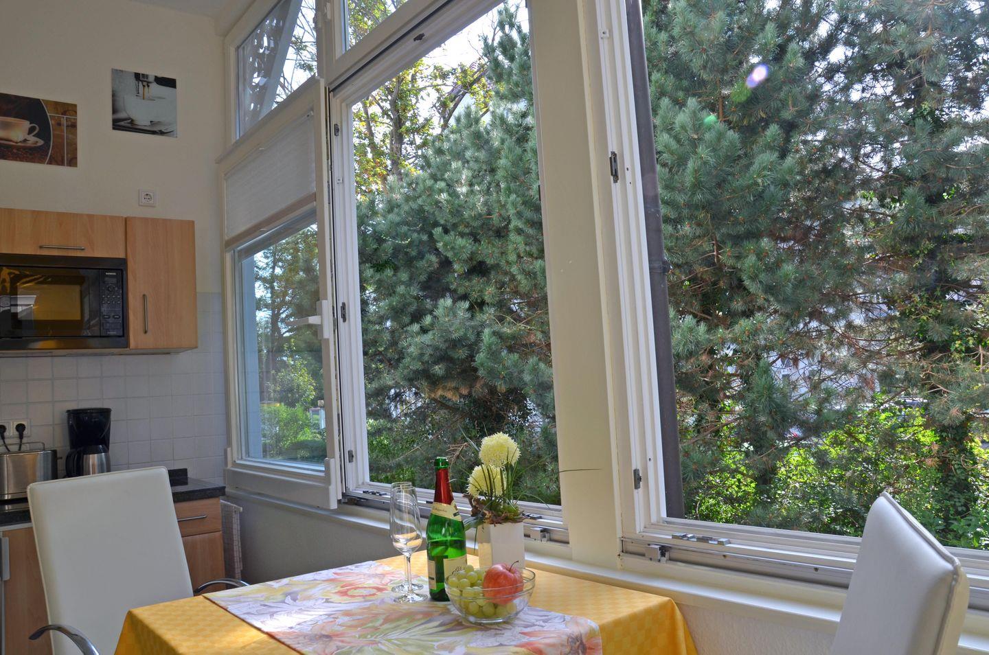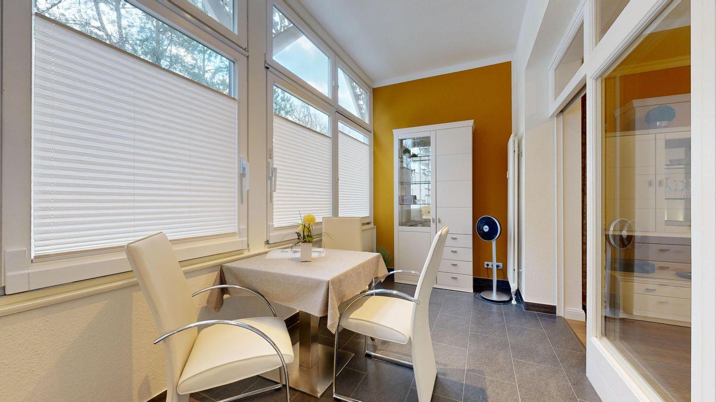 * Veranda: Essplatz, große Fensterfront, Küchenzeile mit Spülmaschine, Cerankochfeld mit 2 Platten, Mikrowelle, Toaster, Kaffeemaschine, Eierkocher, Wasserkocher