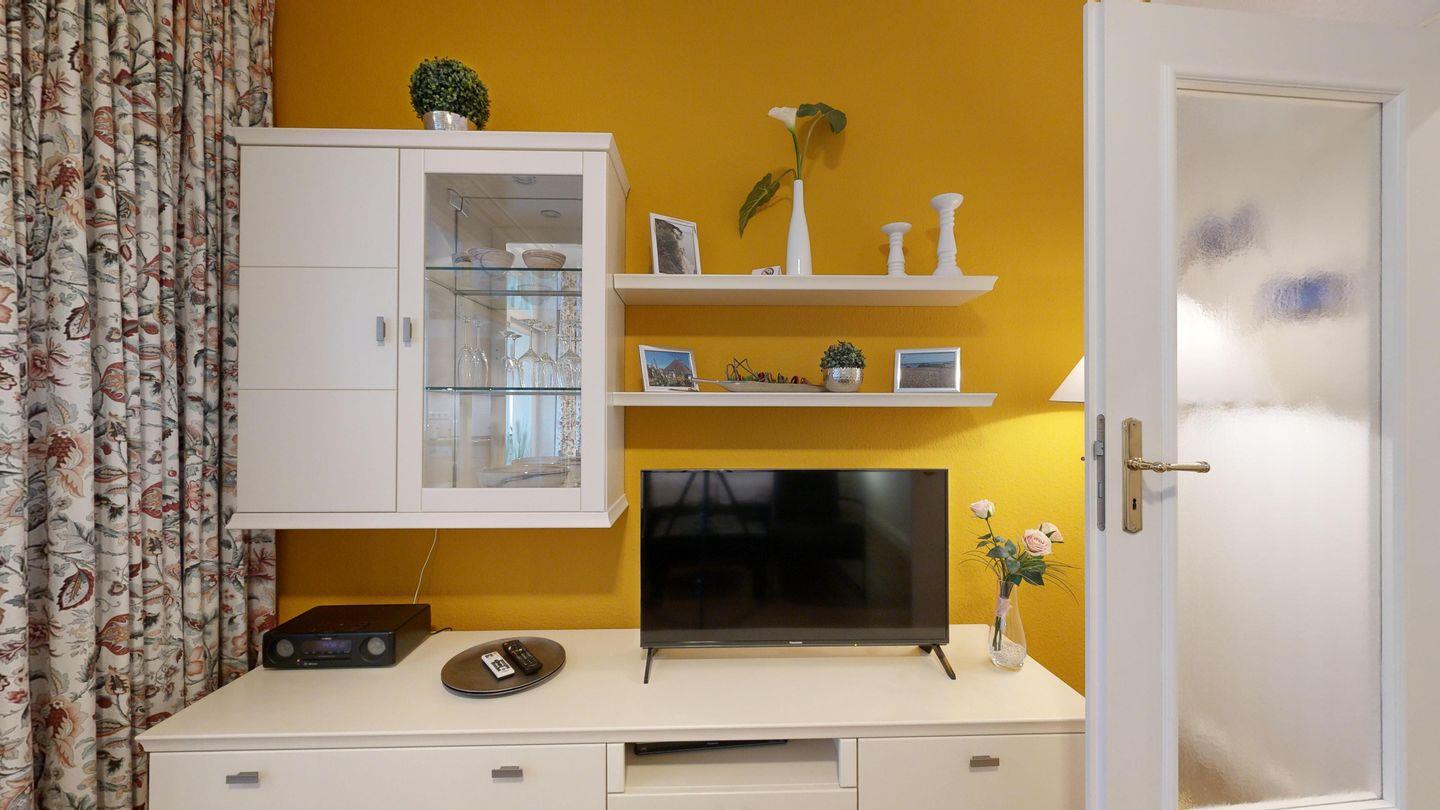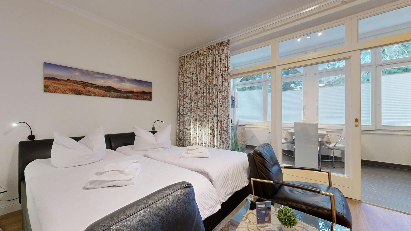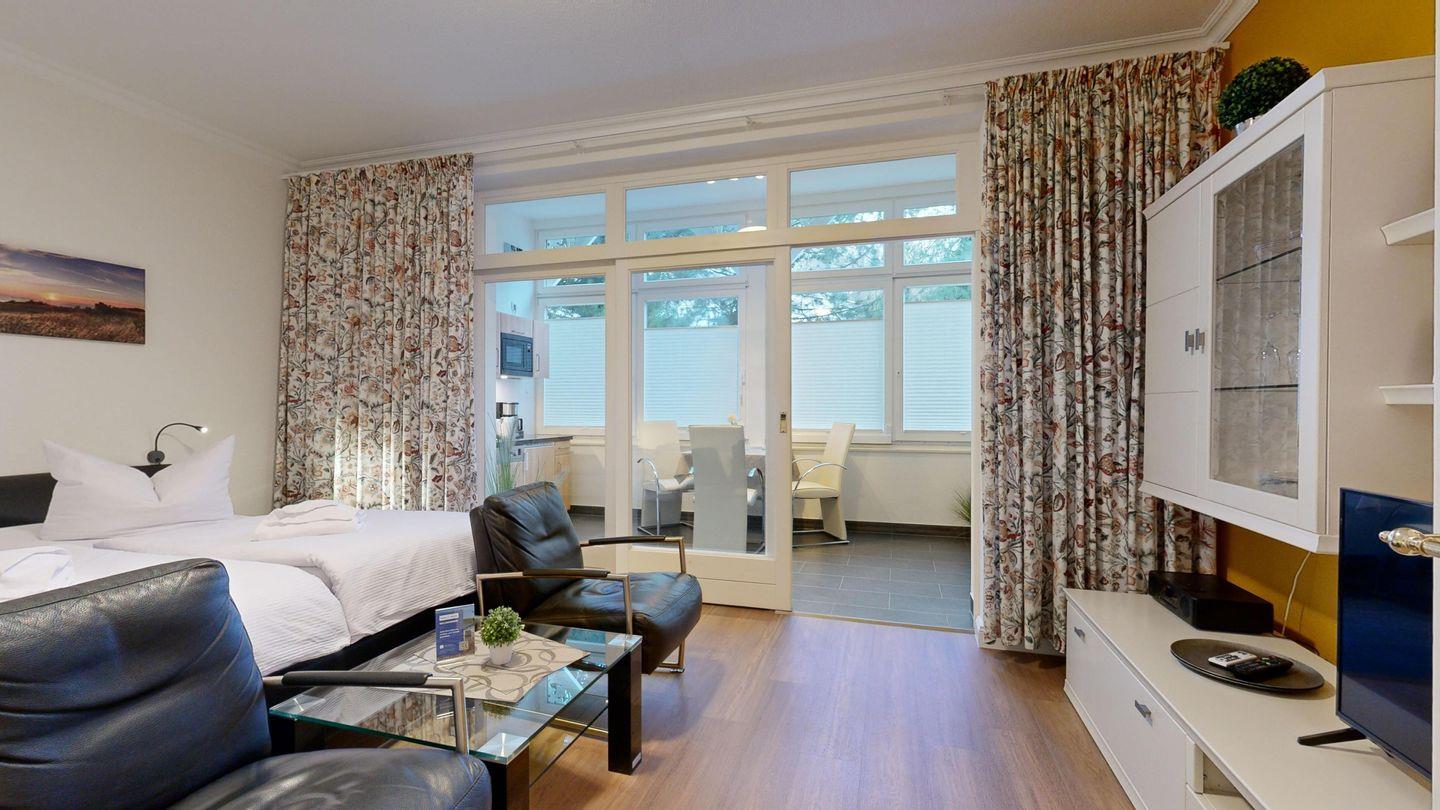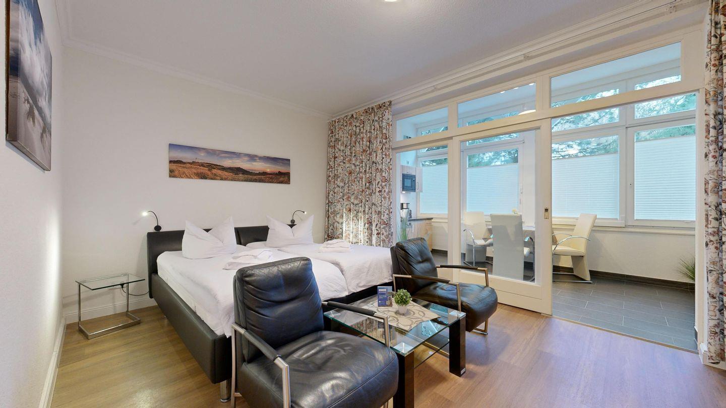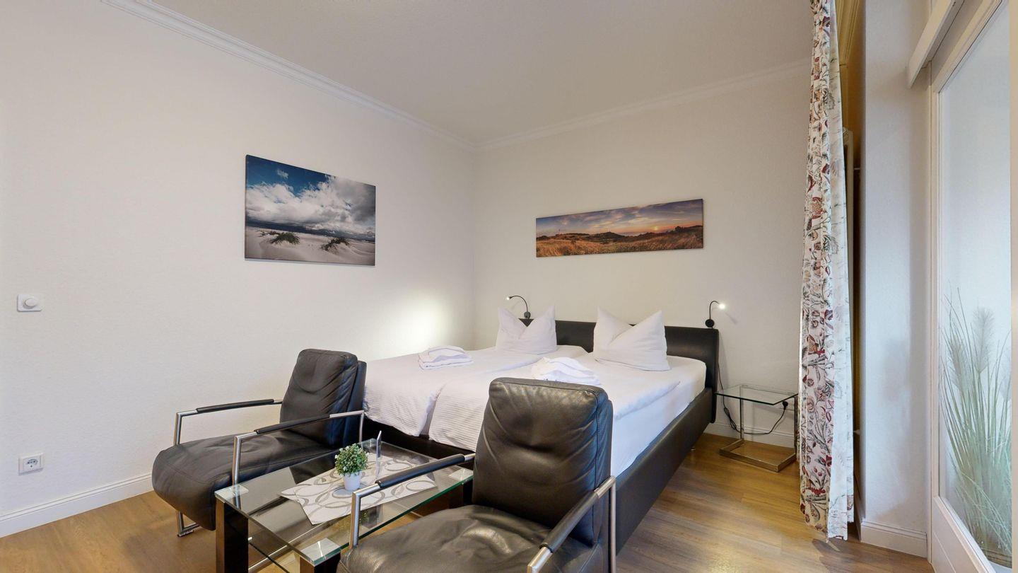 * Wohn-/Schlafraum: Doppelbett mit hochwertigen Federkernbetten, zwei gemütliche Sessel, Kabel-TV (Flachbild), Radio mit CD (Bluetoothfähig) + Blueray- Player