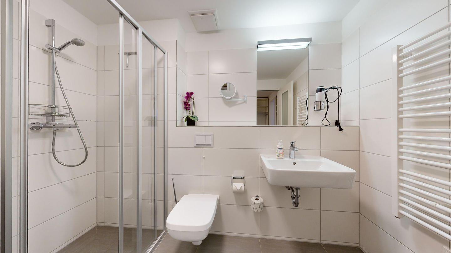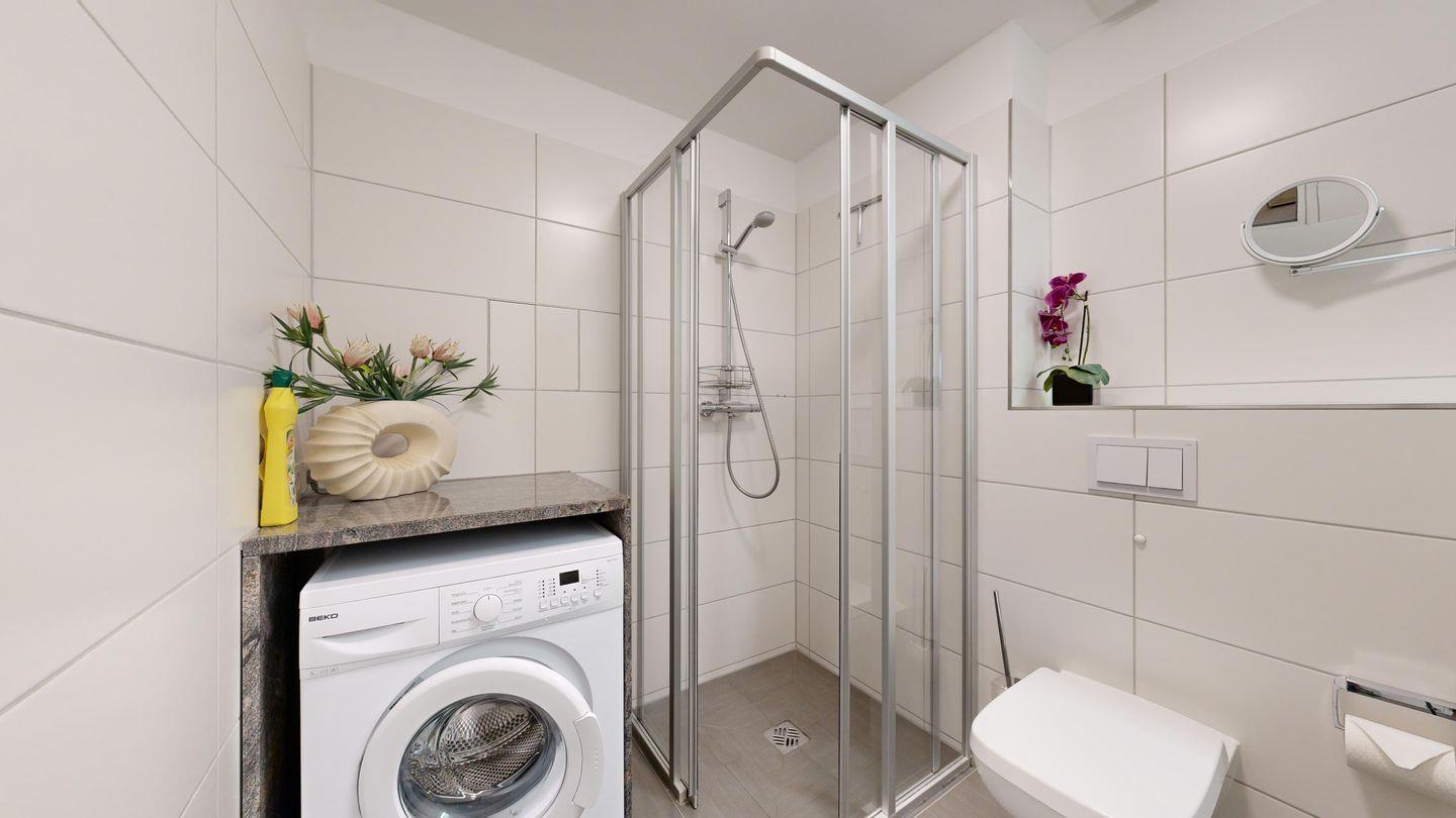 * Badezimmer mit Dusche, WC, Föhn, Waschmaschine