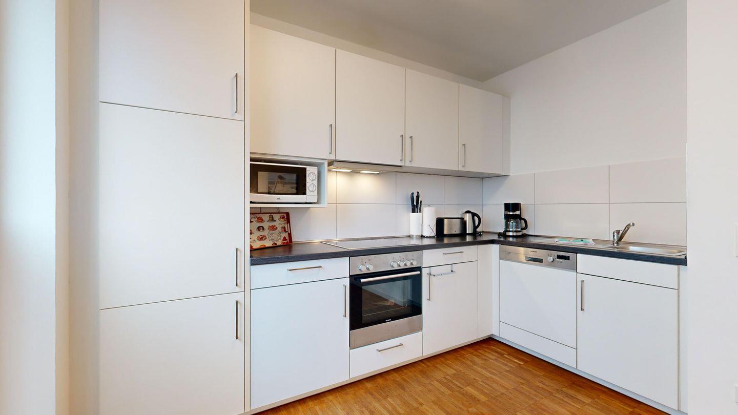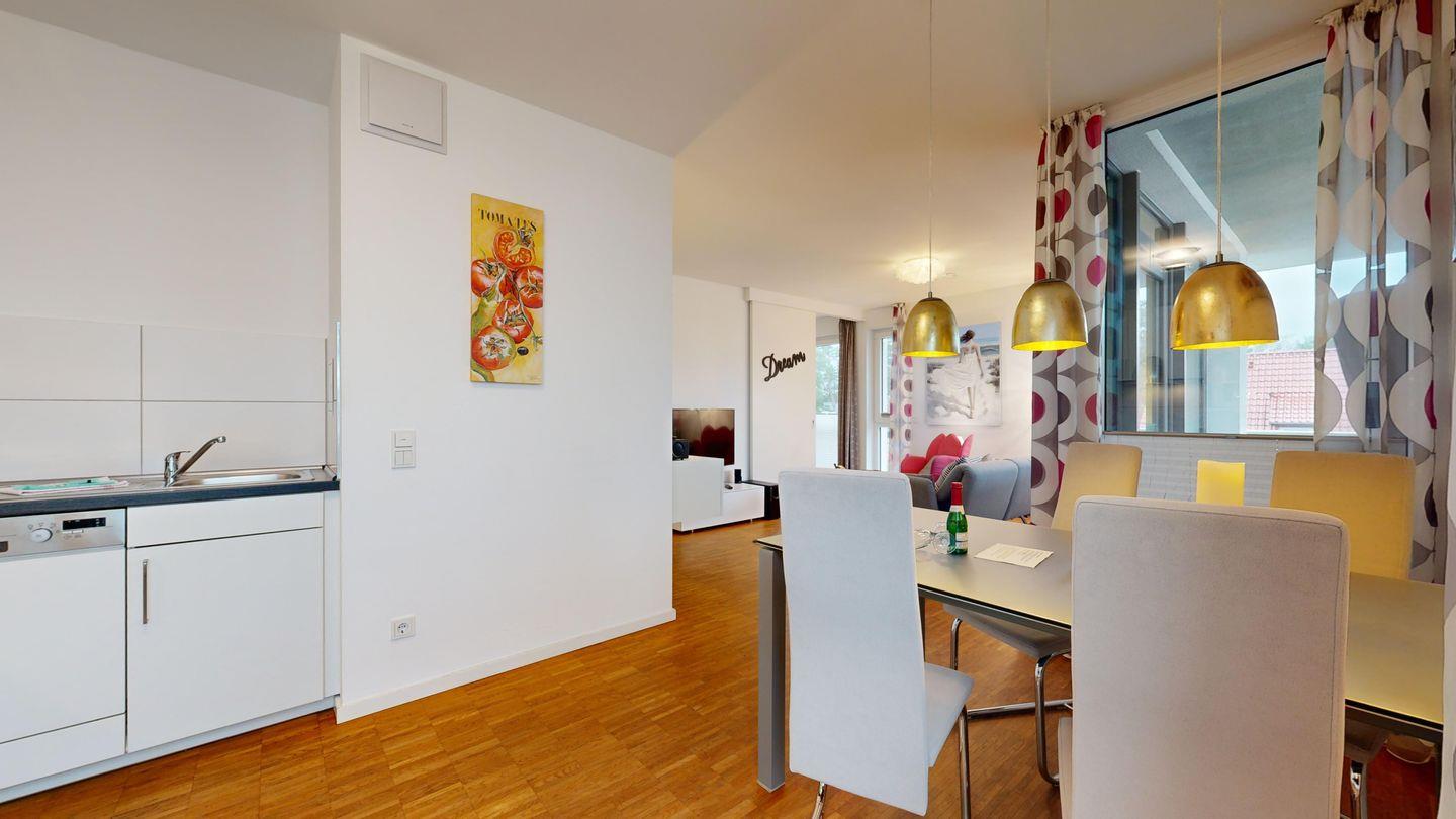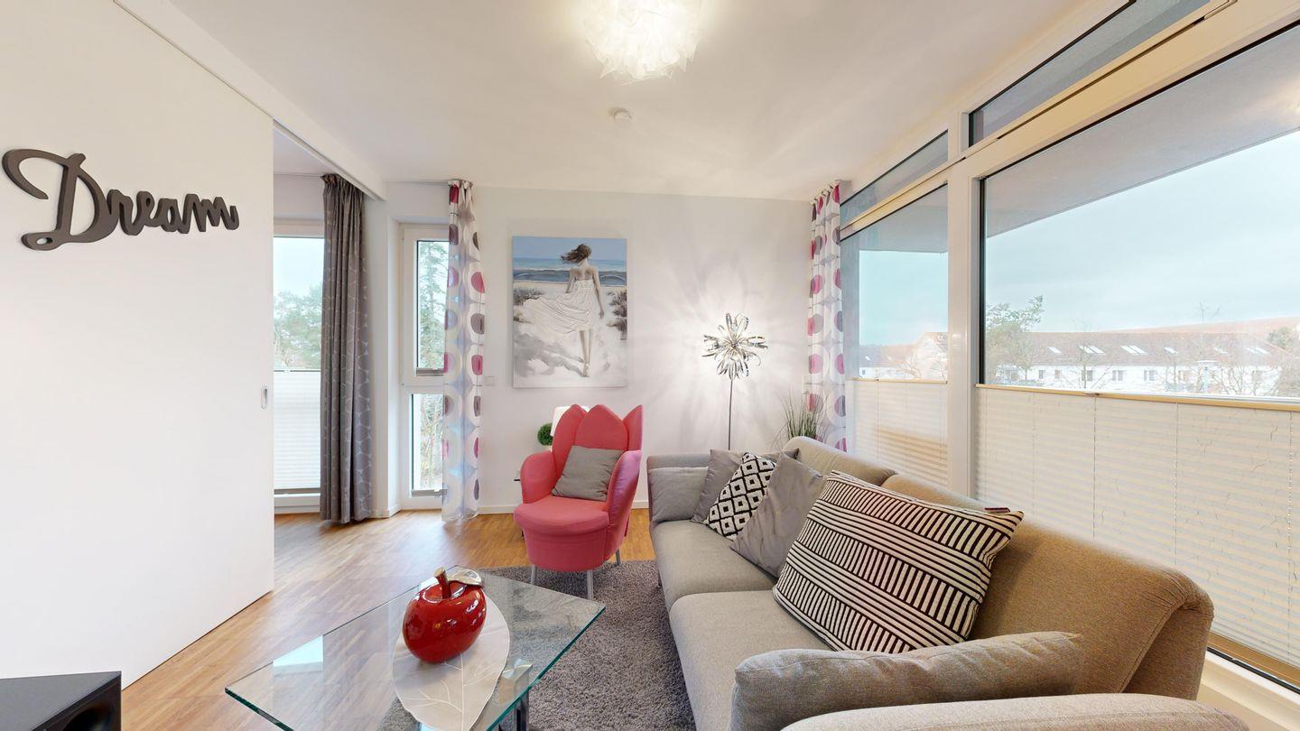 Modern, gemütlich und mit allem Komfort: Diese helle Ferienwohnung mit Südbalkon, offener Küche, Fahrstuhl und Tiefgarage ist ideal für alle, die kurze Wege zum Strand und entspannte Abende in schöner Atmosphäre schätzen.