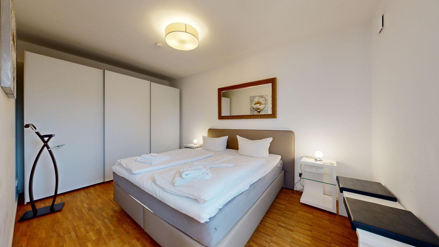 * 1 Schlafzimmer mit einem Doppelbett (Boxspringbett); Schiebetür zum Wohnzimmer.