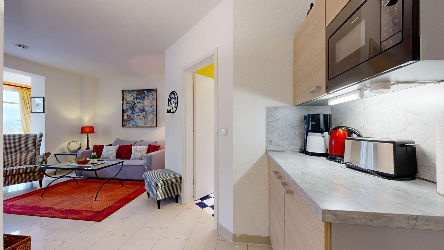 * Küche: Moderne Küchenzeile mit Ceran-Herd, Spülmaschine, Mikrowelle, Wasserkocher, Kaffeemaschine, Toaster