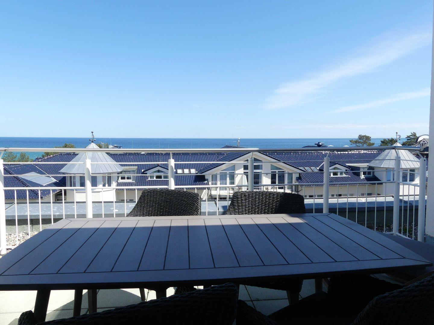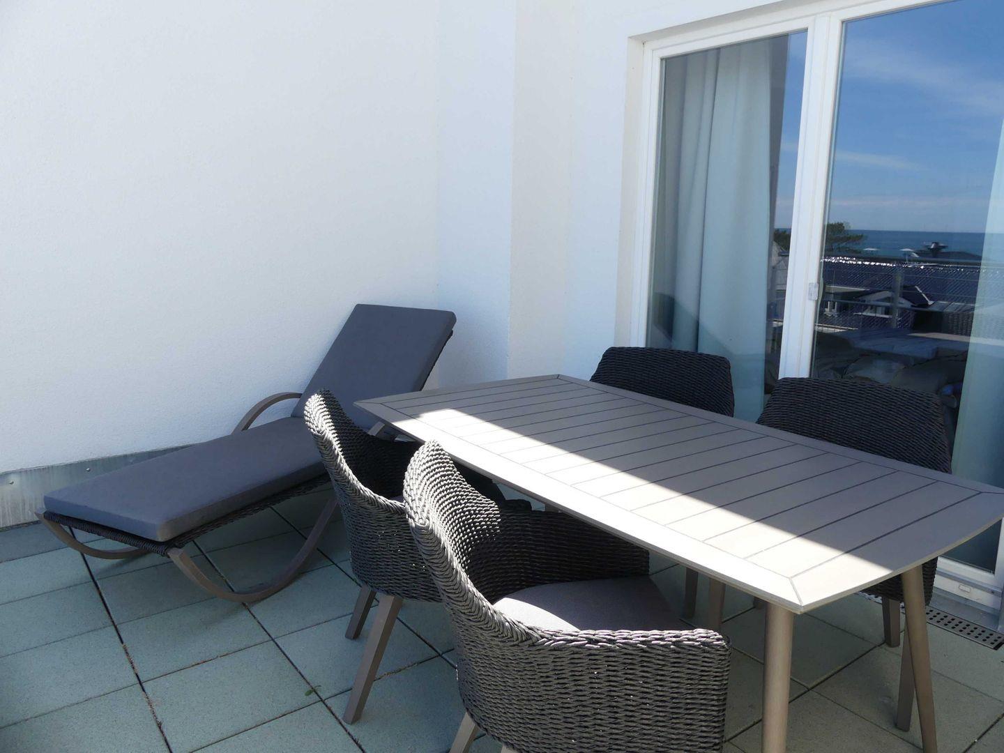 * Möblierte sonnige Dachterrasse (15 m², Nordost Ausrichtung) mit Ostseeblick