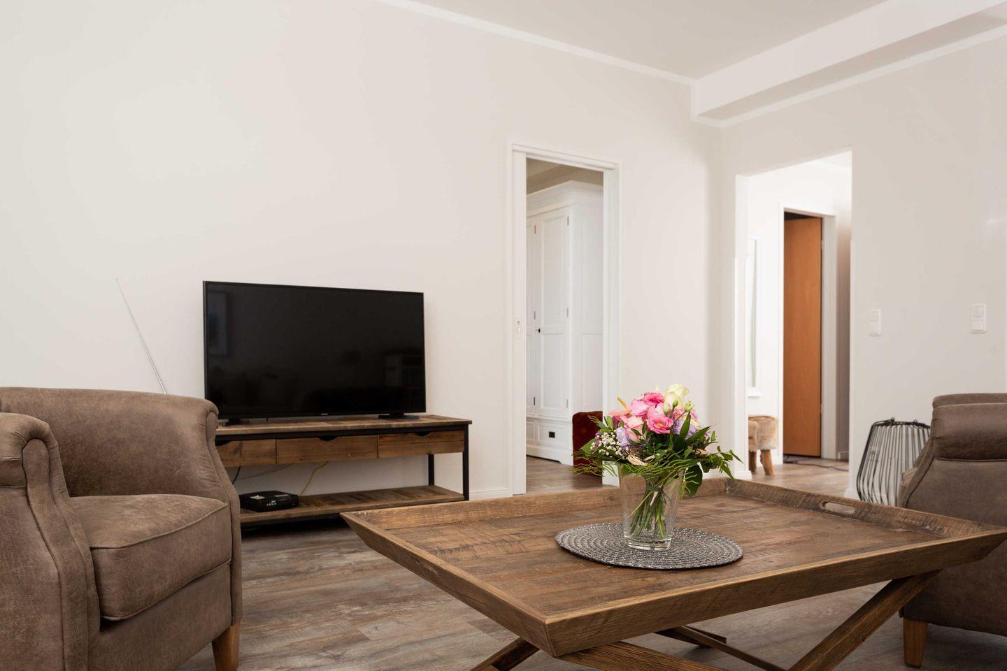 * Helles, großes Wohnzimmer mit Couchgarnitur (Schlafcouch für 1-2 Personen), Sessel, Flachbild-TV, Radio, Leseecke, Internetzugang (WLAN inkl.), Esstisch