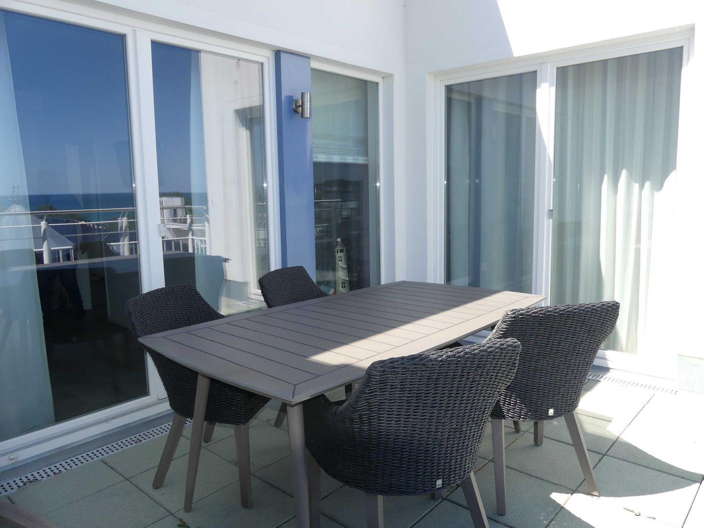 * Möblierte sonnige Dachterrasse (15 m², Nordost Ausrichtung) mit Ostseeblick