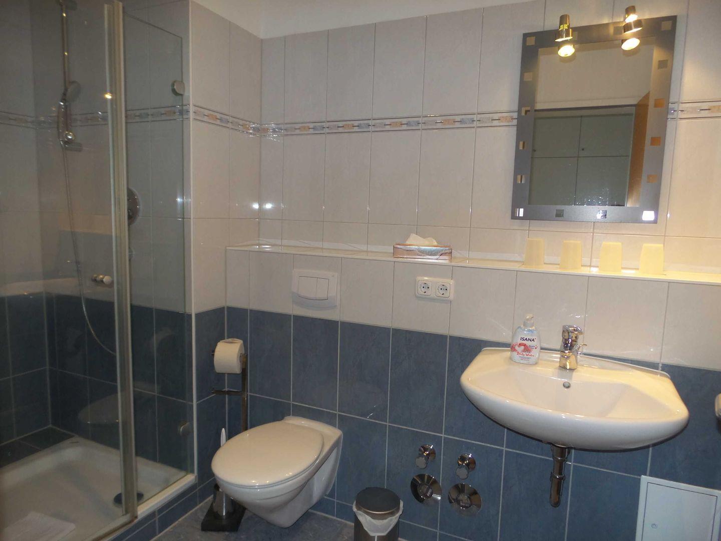 * Badezimmer mit großer Dusche, Föhn und WC