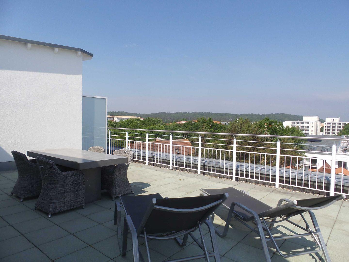 * Möblierte sonnige Dachterrasse über Eck (25 m², Nordost-Ausrichtung) mit fantastischen Ostseeblick