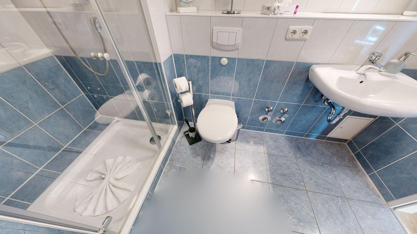 * Badezimmer mit großer Dusche, WC und Föhn