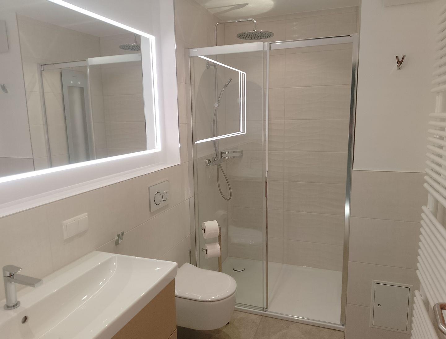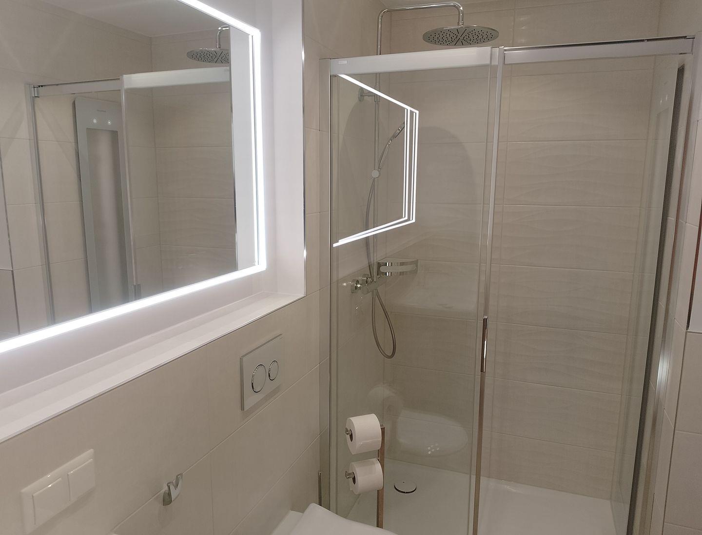 * Komplett neu renoviertes Badezimmer (02/2025) mit großer Infrarot-Dusche, WC und Föhn. Die Infrarotdusche trägt zu einem luxuriösen Wellness-Erlebnis in der Ferienwohnung bei! Gerade in den kälteren Jahreszeiten ist sie ein Highlight der Wohnung!