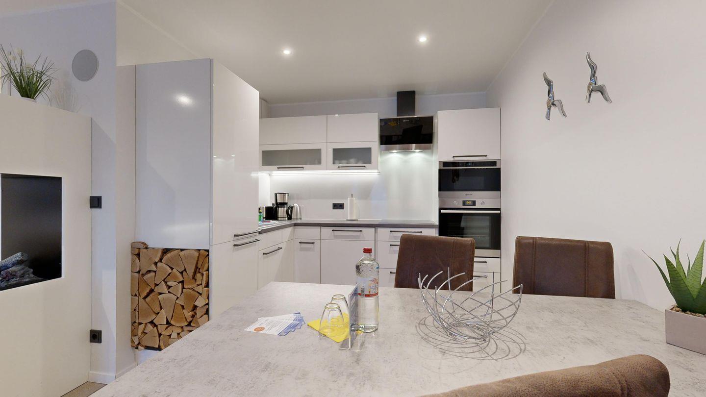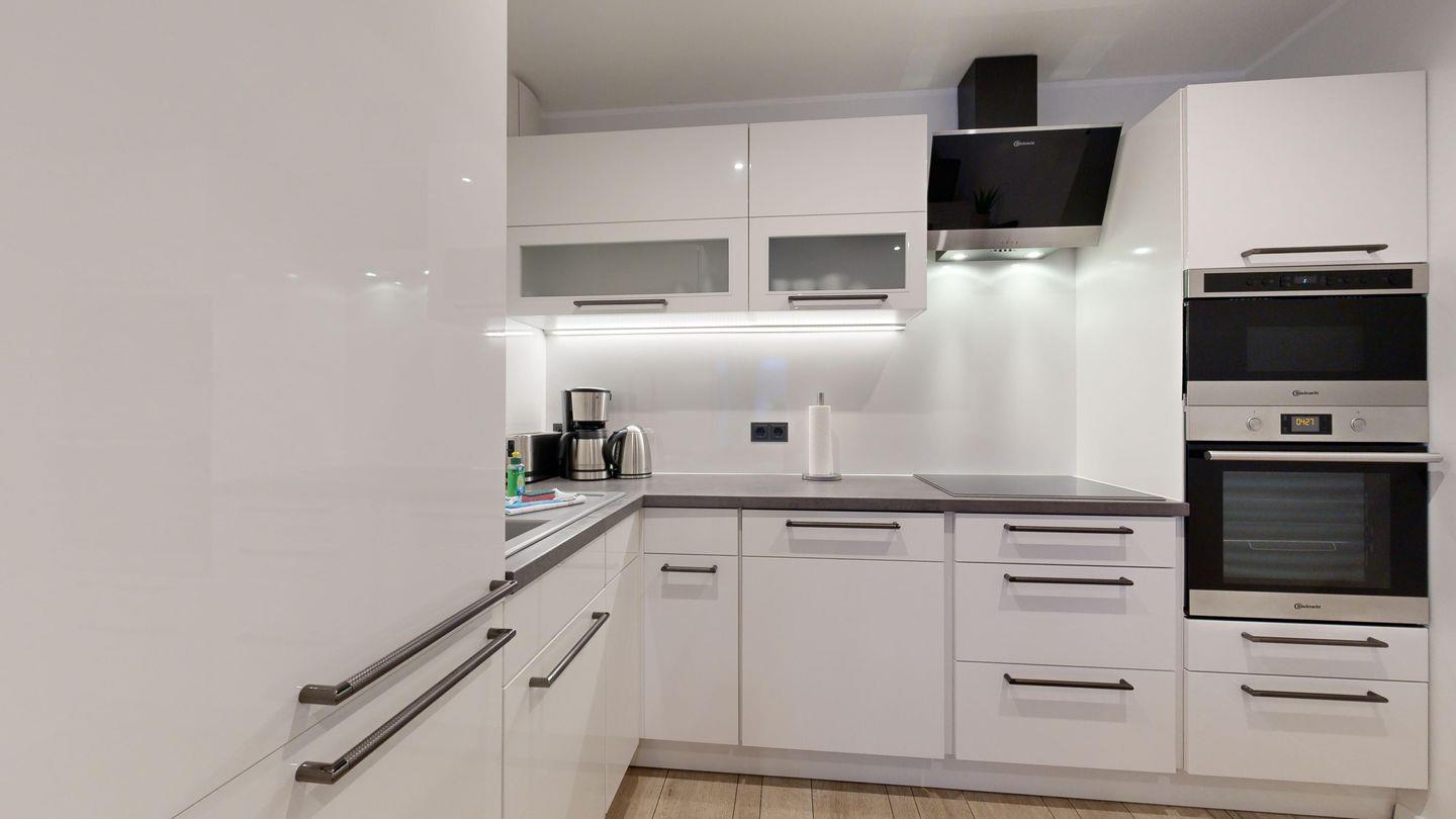 * Neue hochwertige Küche mit Induktionsfeld, Herdhochschrank mit Einbaumikrowelle (Dampfgarfunktion) Kühlschrank mit Kühlgefrierkombination, Backofen, Spülmaschine, Toaster, Wasserkocher, Kaffeemaschine