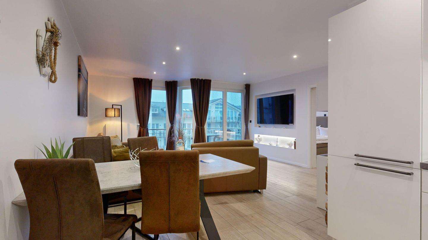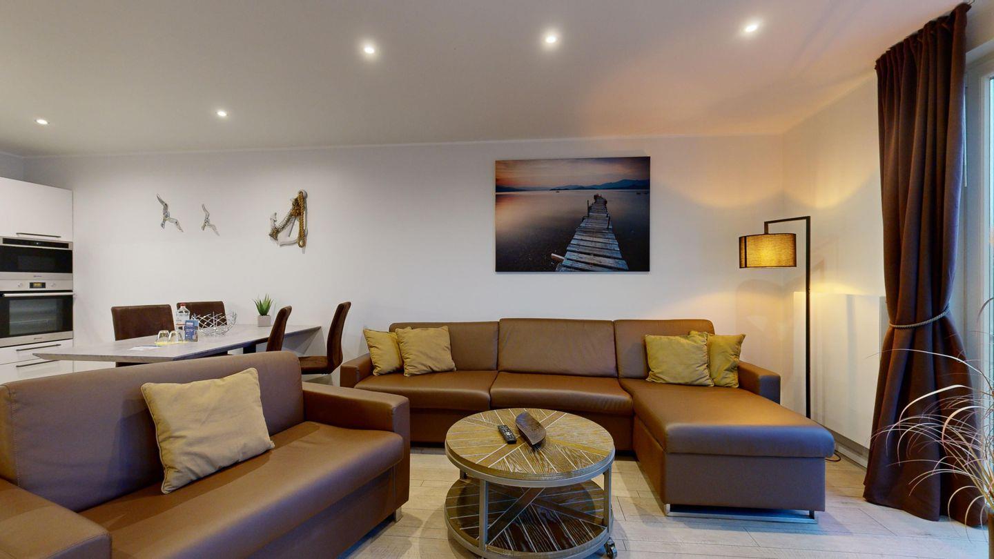 * Wohnzimmer mit großer Eck-Couchgarnitur (Schlafcouch für 2 Personen), Sessel, Flachbild-TV (65 Zoll), Radio, Internetzugang (WLAN inkl.), Esstisch