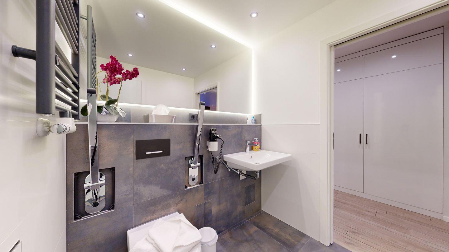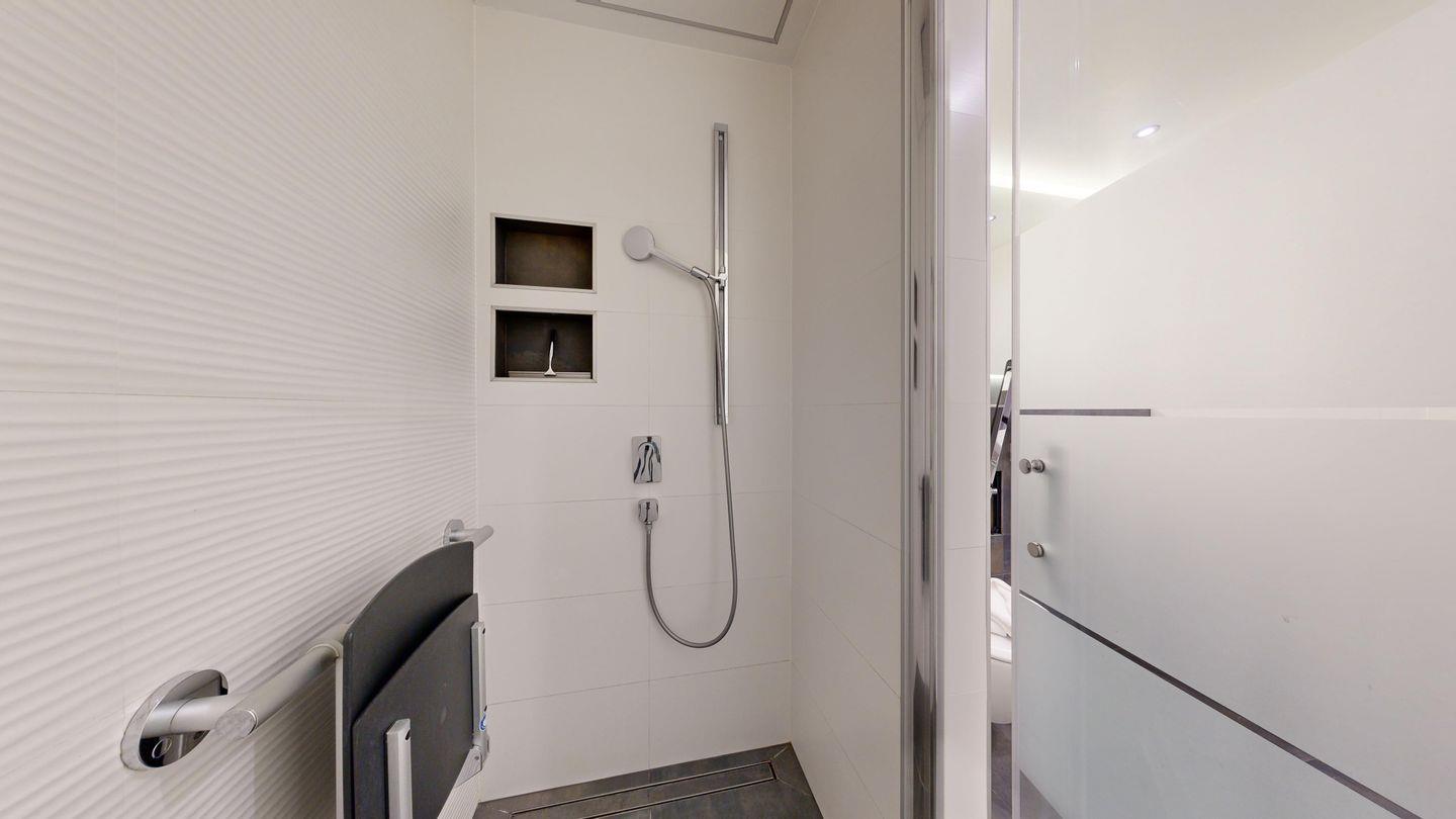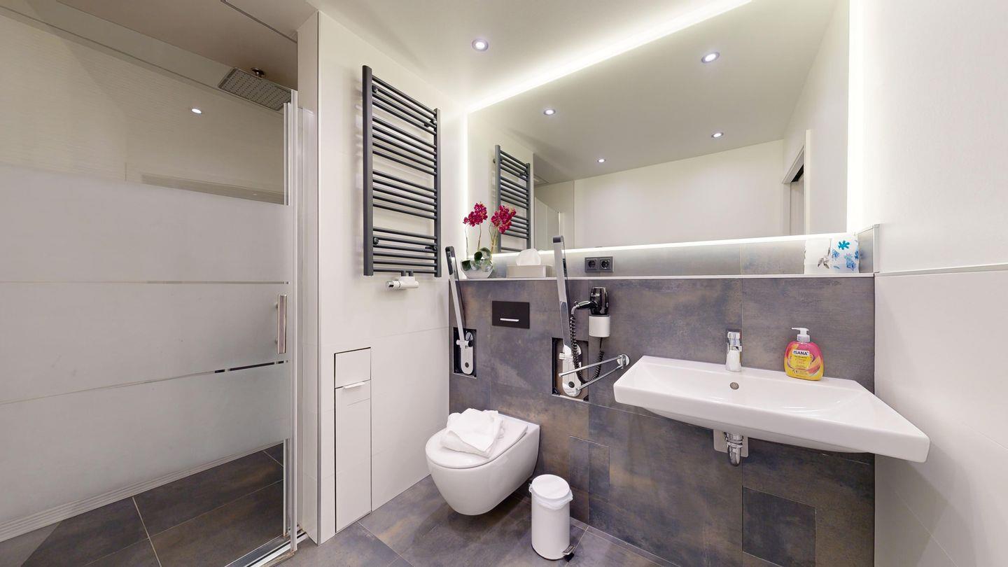 * Behindertenfreundliches Badezimmer (Schiebetürbreite 0,90 m) mit Dusche/Tiefeinsteiger, WC und Föhn. Die Dusche ist mit Rollstuhl befahrbar, klappbarer Sitzhocker. Der Waschtisch ist unterfahrbar. Haltegriffe am WC
