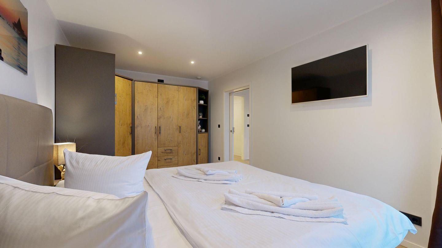 * 1 Schlafzimmer mit einem Doppelbett (Boxspringbett), Kleiderschrank und TV (40 Zoll), Bügelbrett+Bügeleisen. Zusätzlich ist im Schlafzimmer ein Schrankbett für eine Person.