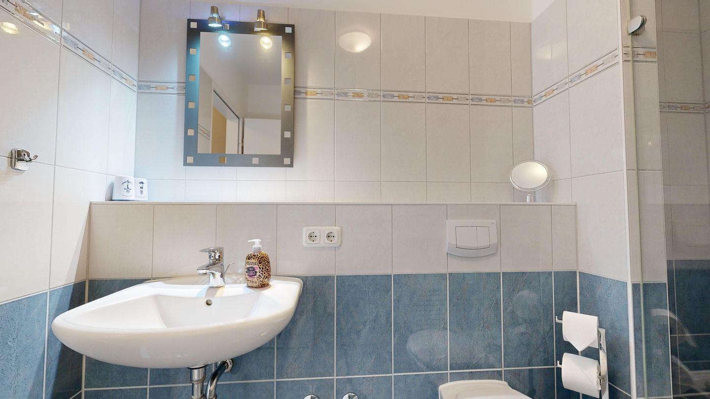 * Badezimmer mit großer Dusche, WC, Föhn