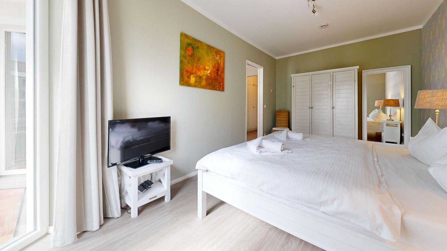* 1 Schlafzimmer mit einem Doppelbett, Kleiderschrank, TV-Gerät