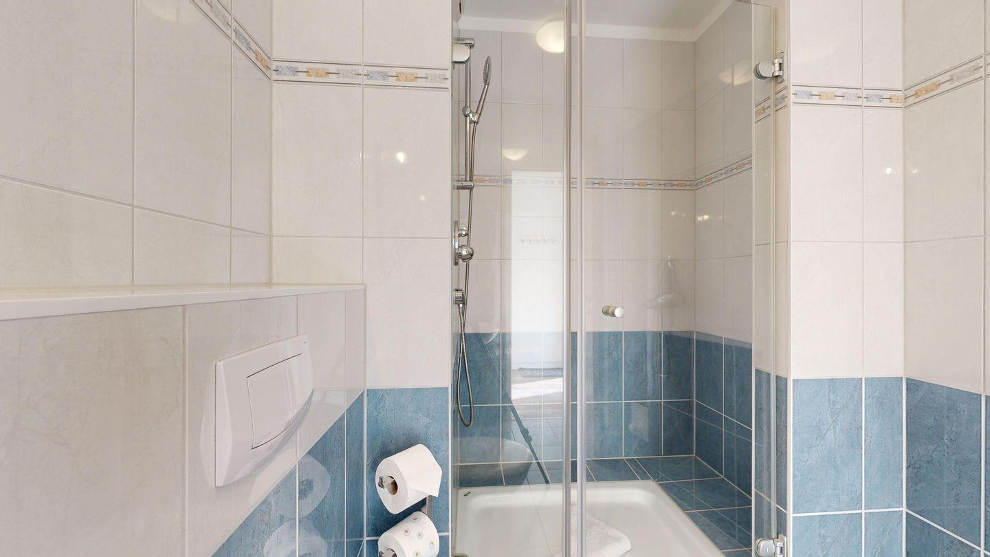 * Badezimmer mit großer Dusche, Föhn und WC