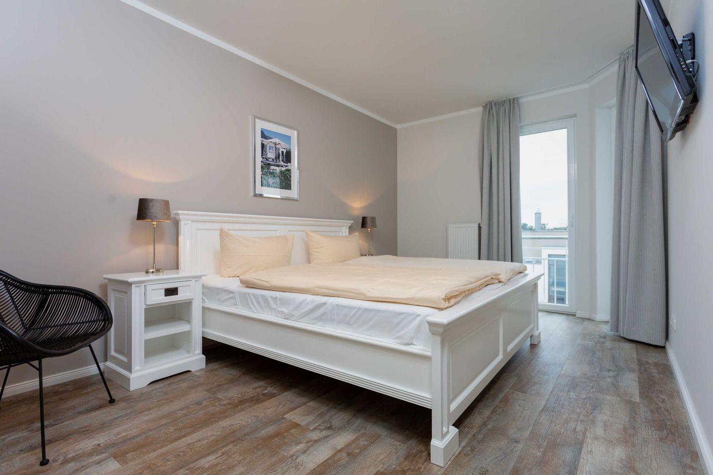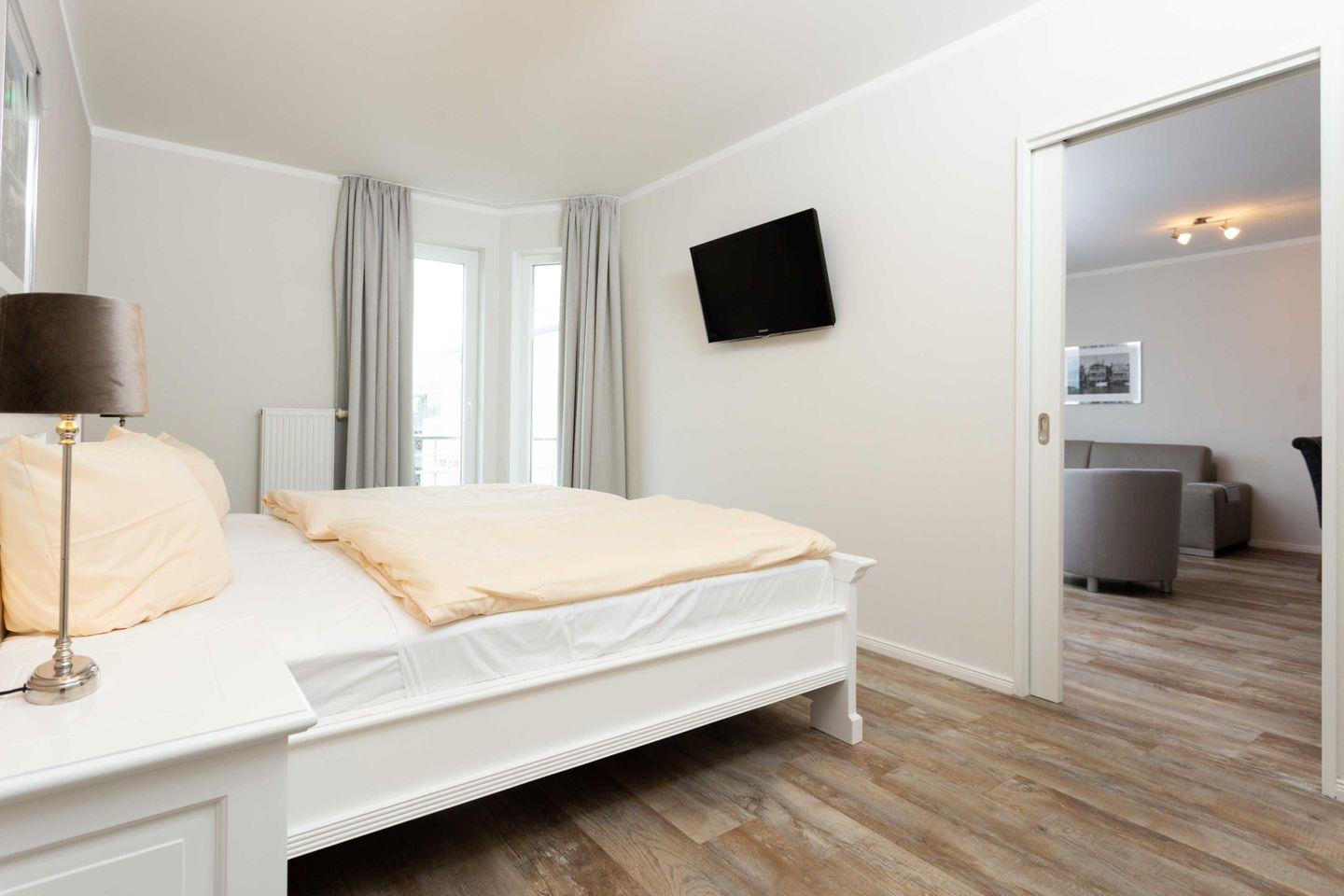 * 1 Schlafzimmer mit einem Doppelbett, Kleiderschrank und TV