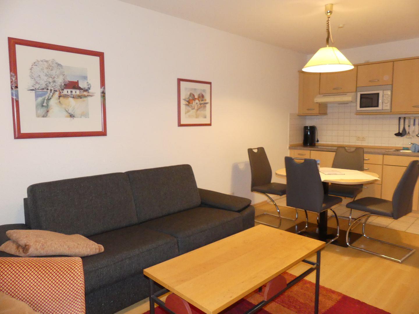 * Wohnzimmer: Couchgarnitur (Schlafgelegenheit für 2 Personen), Kabel-TV, Stereoanlage, Internetanschluss (WLAN), Esstisch