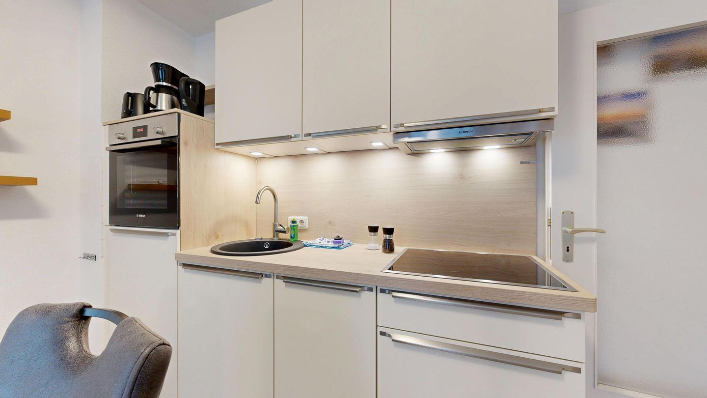 * Küchenzeile mit Spülmaschine, Ceranfeld, Mikrowelle, Kaffeemaschine, Toaster und Kühlschrank mit Gefrierfach