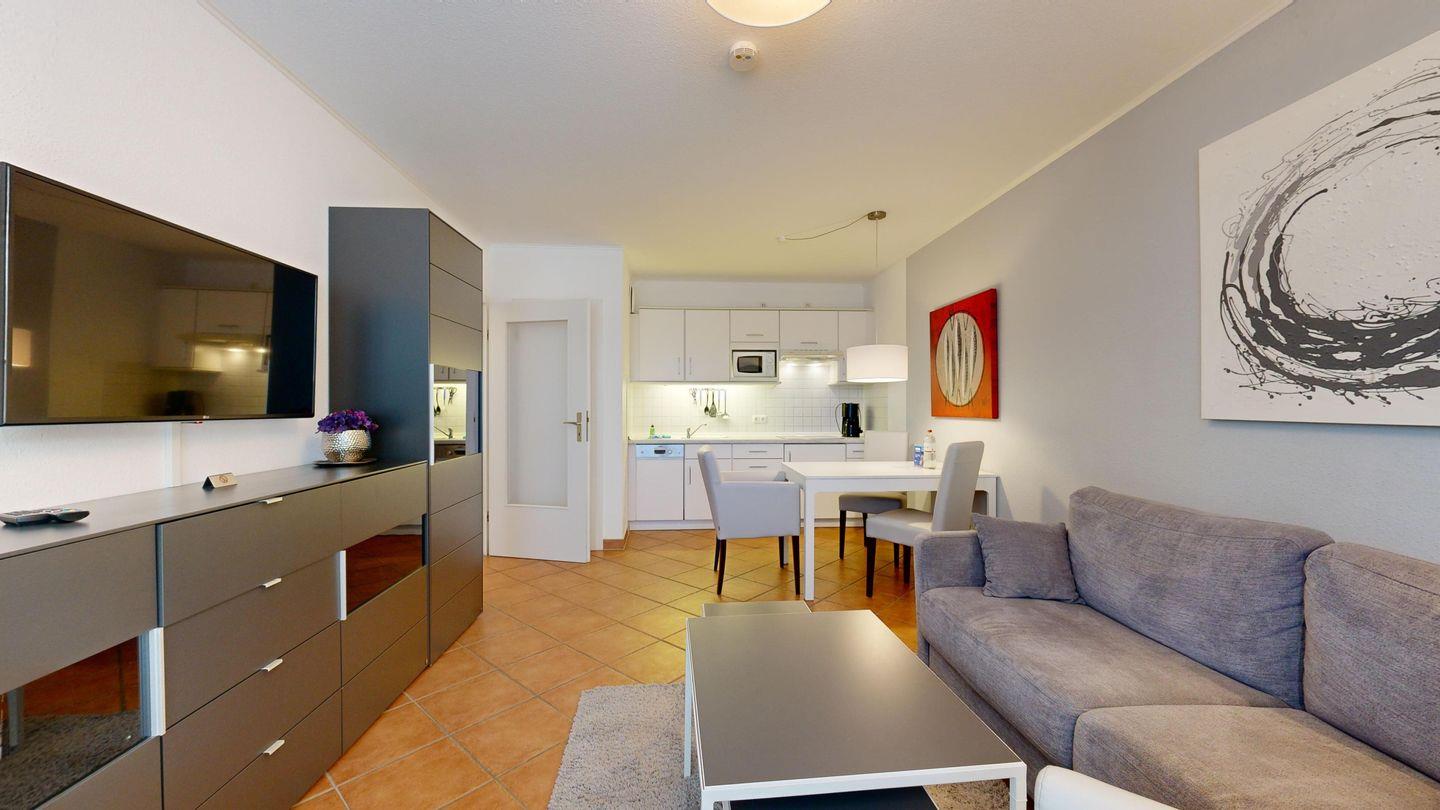 * Wohnzimmer: Couchgarnitur (Schlafgelegenheit für 2 Personen), Kabel-TV, Stereoanlage, Internetanschluss (WLAN), Esstisch