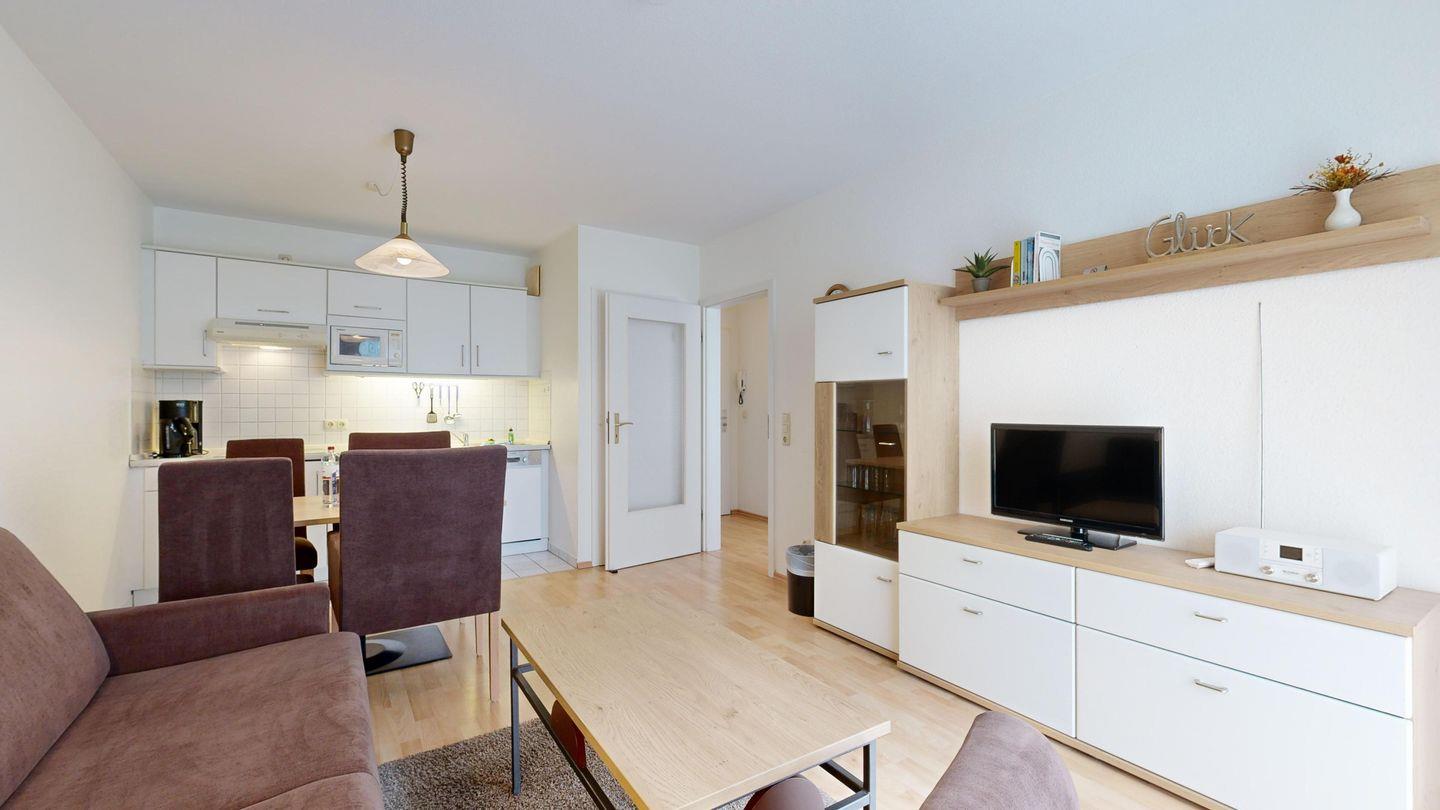 * Wohnzimmer: Couchgarnitur (Schlafgelegenheit für 2 Personen), Kabel-TV, Stereoanlage, Internetanschluss (WLAN), Esstisch