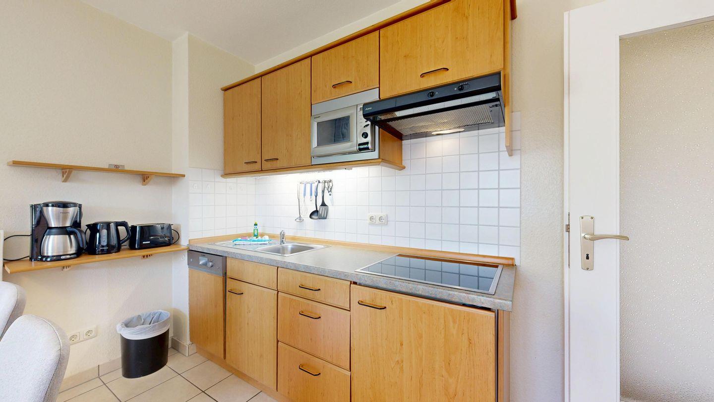* Küchenzeile mit Spülmaschine, Ceranfeld, Mikrowelle, Kaffeemaschine, Toaster und Kühlschrank mit Gefrierfach