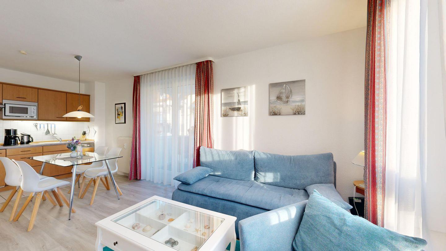 * Wohnzimmer: Couchgarnitur (Schlafgelegenheit für 2 Personen), Kabel-TV, Stereoanlage, Internetanschluss-WLAN, Esstisch
