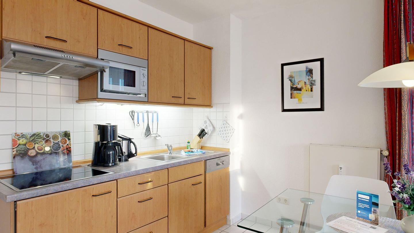 * Küchenzeile mit Spülmaschine, Ceranfeld, Mikrowelle, Kaffeemaschine, Toaster und Kühlschrank mit Gefrierfach