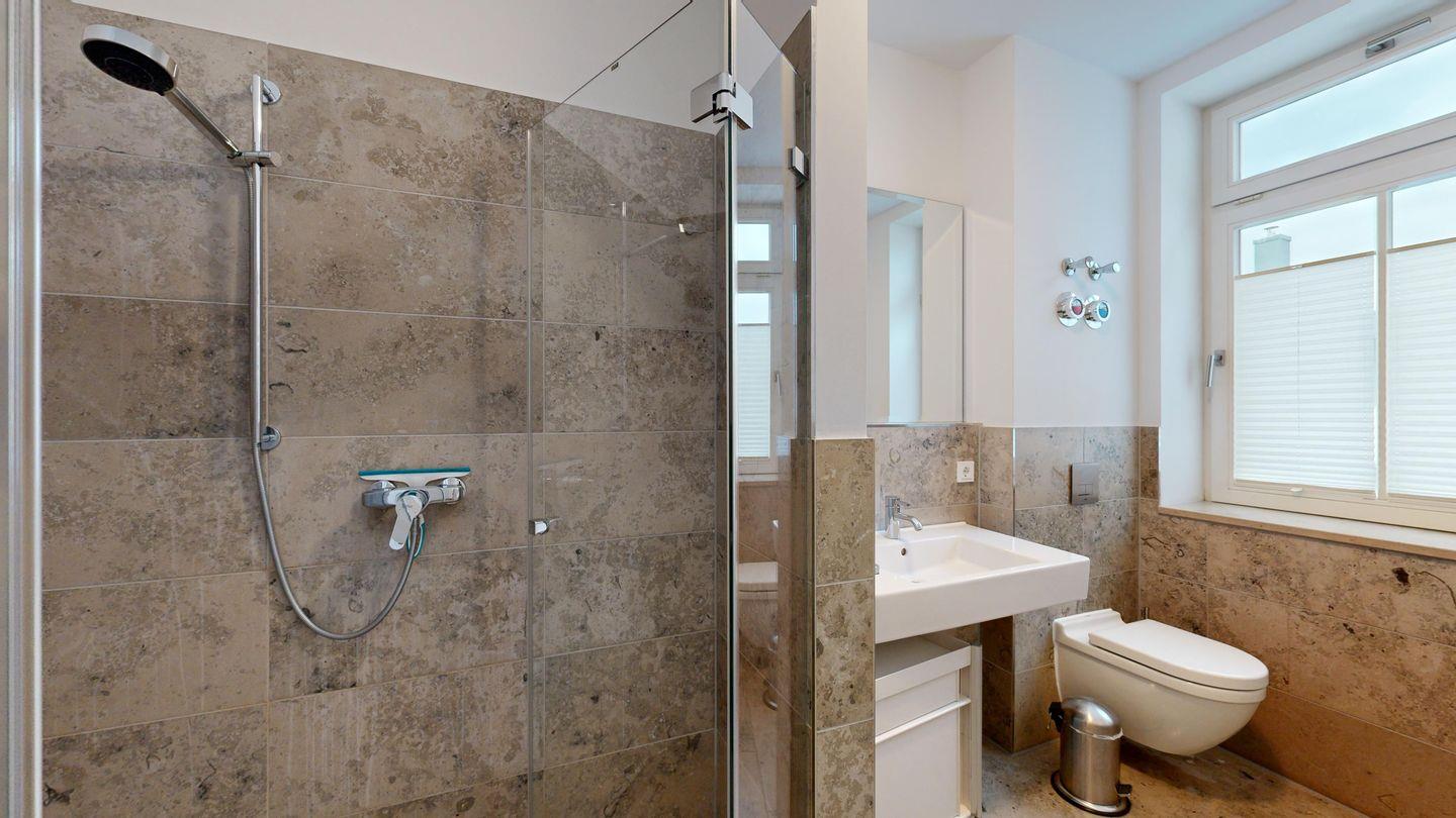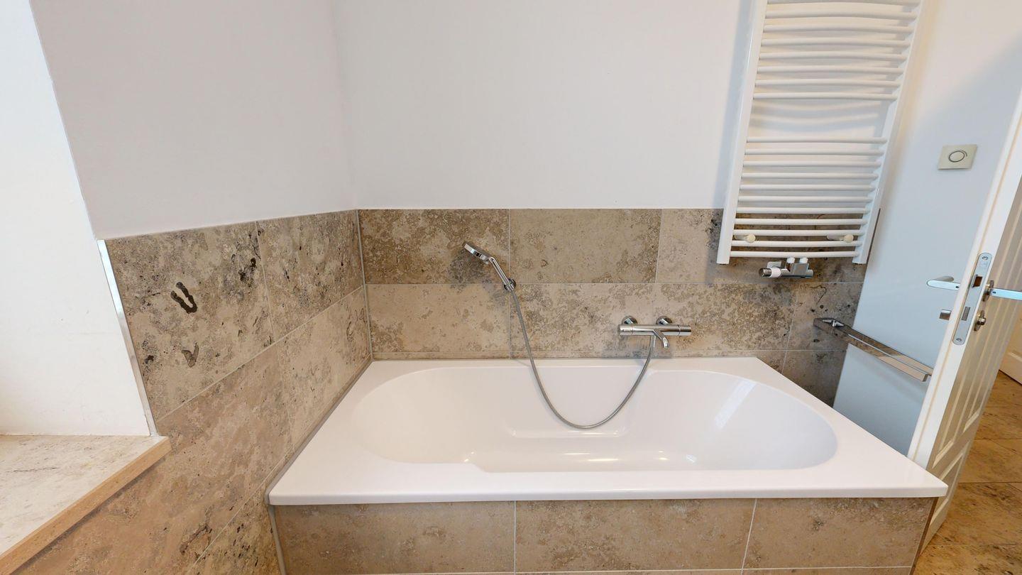 * Großes Badezimmer mit Dusche und Badewanne, Waschbecken, WC, Haartrockner, Handtuch-Heizkörper